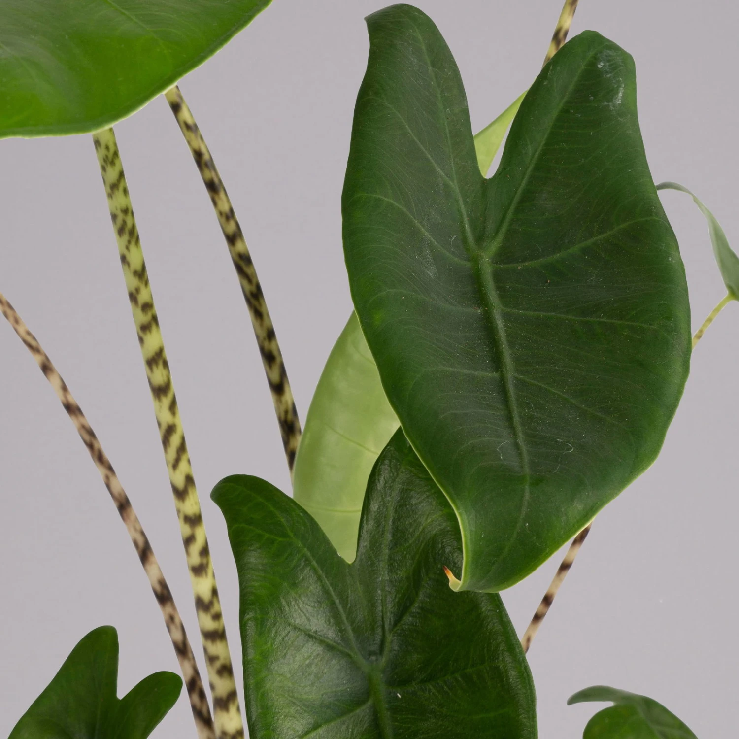 Das Pfeilblatt (Alocasia ‚Zebrina‘), auch unter den Namen Alokasie oder Elefantenohr bekannt, ist eine prächtige Blattschmuckpflanze, welche ursprünglich aus dem tropischen asiatischen Raum stammt und besonders durch die großen, oft kontraststarken Blätter überzeugt. Charakteristisch ist die herz- und pfeilförmige Form der Blätter, die bis zu 30 cm lang werden können und das satte Grün. Die Pflanze zählt zur Familie der Aronstabgewächse und besitzt auffällige grün-weiß gestreifte Blattstiele. Am Naturstandort werden Pfeilblätter bis zu 8 Meter groß, in der Wohnung erreichen nur wenige Arten Höhen von mehr als 1,50 Metern.