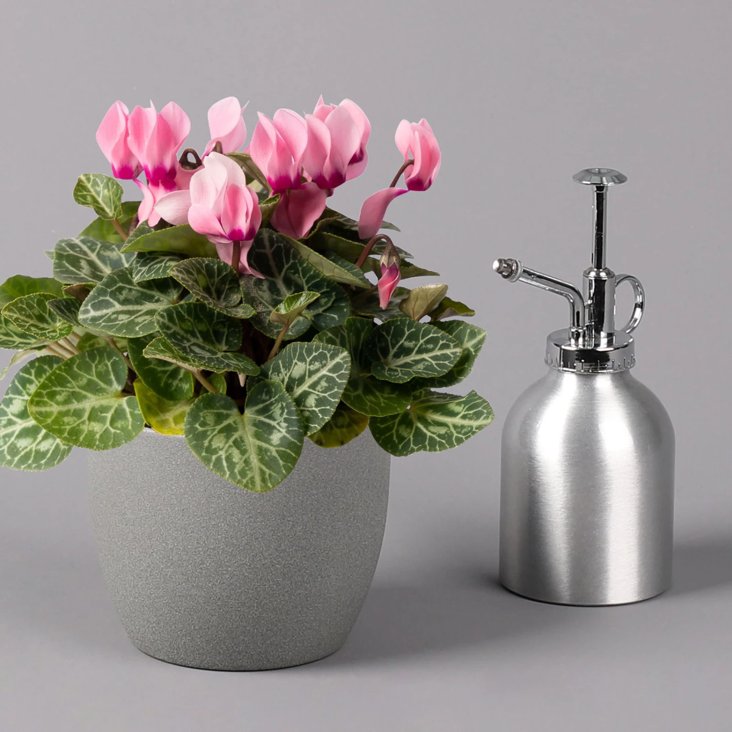 Das Alpenveilchen bevorzugt helle Standorte ohne direkte Sonneneinstrahlung bei Temperaturen zwischen 14 und 18 °C. Je kühler der Standort, desto länger halten die Blüten. Bei zu warmen Plätzen, beispielsweise direkt über der Heizung, wirft die Pflanze teilweise ihre Blätter ab und die Blüten verwelken schneller. Achten Sie beim Gießen auf ein konstant leicht feuchtes, aber nicht zu nassem Substrat. Hierzu bietet sich die Bewässerung von unten über den Untersetzer oder den Übertopf an. Lassen Sie die Erdoberfläche antrocknen, bevor Sie erneut gießen, um Staunässe zu vermeiden. Nach der Blüte verringert sich der Wasserbedarf der Pflanzen; achten Sie daher darauf, in den Sommermonaten sparsamer zu gießen. Von September bis Mai benötigt das Zimmer-Alpenveilchen alle 2 Wochen eine Nährstoffgabe mit einem Blühpflanzendünger über das Gießwasser. In den Sommermonaten sollte die Düngung komplett eingestellt werden.
