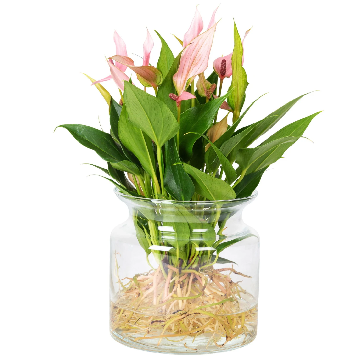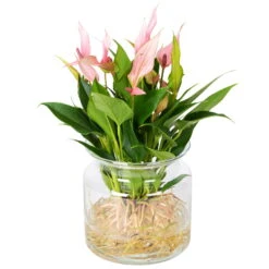 Mit dieser exklusiven Pflanzenschönheit holen Sie sich einen ganz besonderen Eyecatcher nach Hause: Diese exotische Flamingoblume (Anthurium) der Sorte ‚Lilli‘ kommt ganz ohne Erde aus und gedeiht ausschließlich in Wasser. In Kombination mit den rosa, lackartigen Hüllblättern der Blüten und den glänzenden, lanzettlichen Blättern ziehen die freigelegten Wurzeln in der modernen Glasvase mit Sicherheit alle Blicke auf sich! Aber auch als Geschenk ist diese Rarität für jeden Zimmergärtner eine schöne Idee.