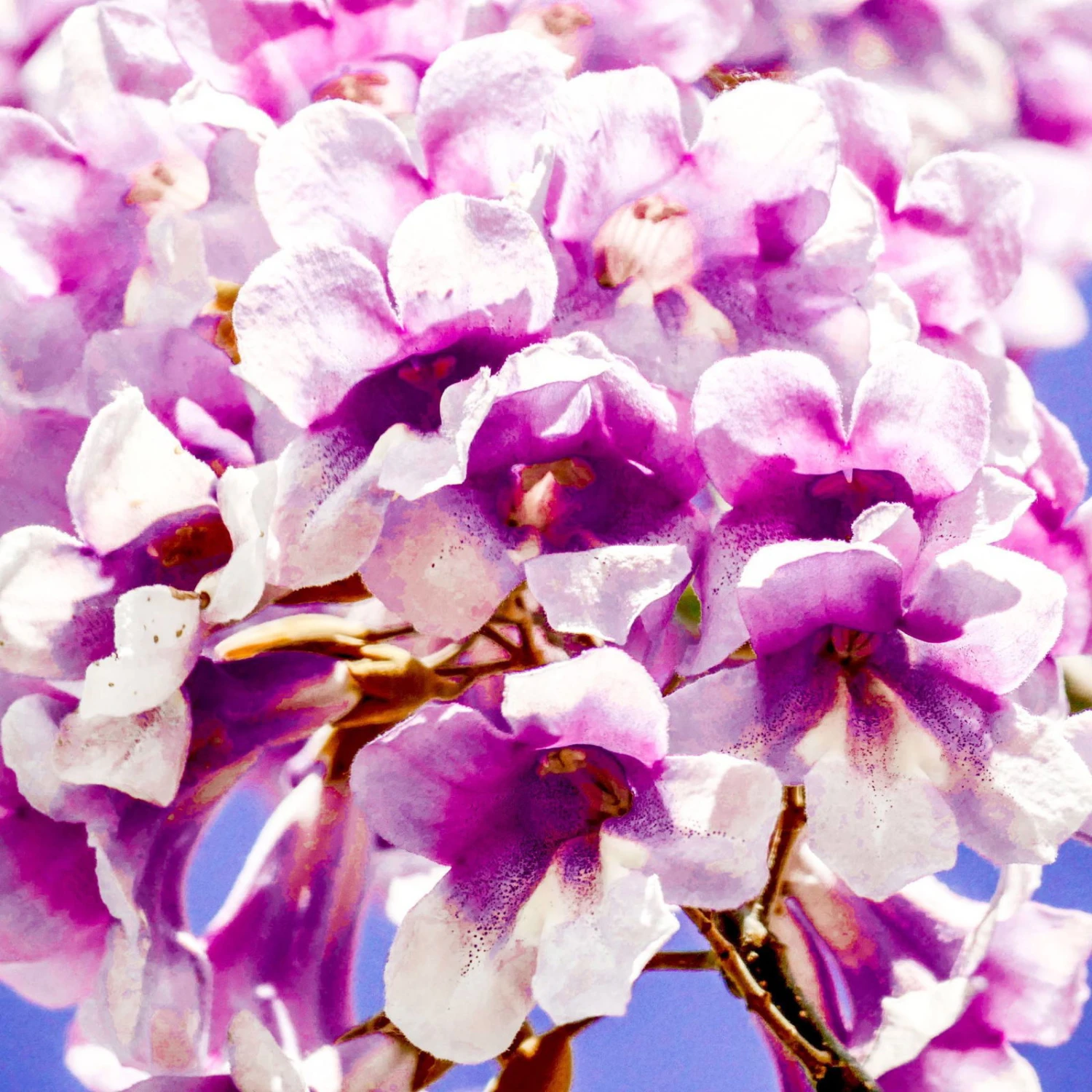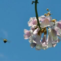 Wenn der Baum 3 Jahre alt ist, bilden sich ab Ende April aus im Vorjahr gebildeten Knospen unzählige, blauviolett gefärbte Glockenblüten, die in bis zu 30 cm langen, aufrechten Rispen stehen und an die Blüten des Fingerhuts erinnern. Sie verströmen einen leichten Duft und dienen 6 Wochen lang Bienen und anderen Insekten als wertvolle Nahrungsquelle. Aus den Blüten entstehen später graubraune, walnussgroße Kapselfrüchte, deren Hüllen auch nach dem Öffnen zum Teil bis weit in den Winter hinein am Baum zu sehen sind.