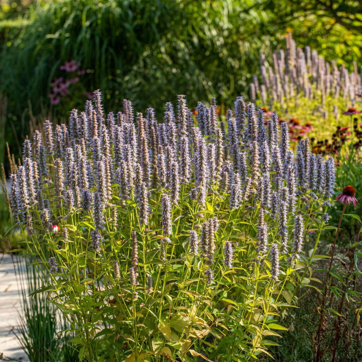 Der Dauerblüher im Staudenbeet. Mit guter Fernwirkung zieht die Agastache alle Blicke auf sich. Zauberhaft sind die violettblauen Blüten, die die winterharte Staude von Juli bis September zieren. Besonders auffallend sind die aufrecht stehenden Blütenähren der robusten Staude. Stolz präsentieren sich die fein duftenden Blüten und ziehen gleichzeitig Schmetterlinge, Hummeln, Bienen und andere Insekten magisch an. Eine Pracht für die Staudenrabatte und ideal für naturnahe Gärten mit Wildblumencharakter.