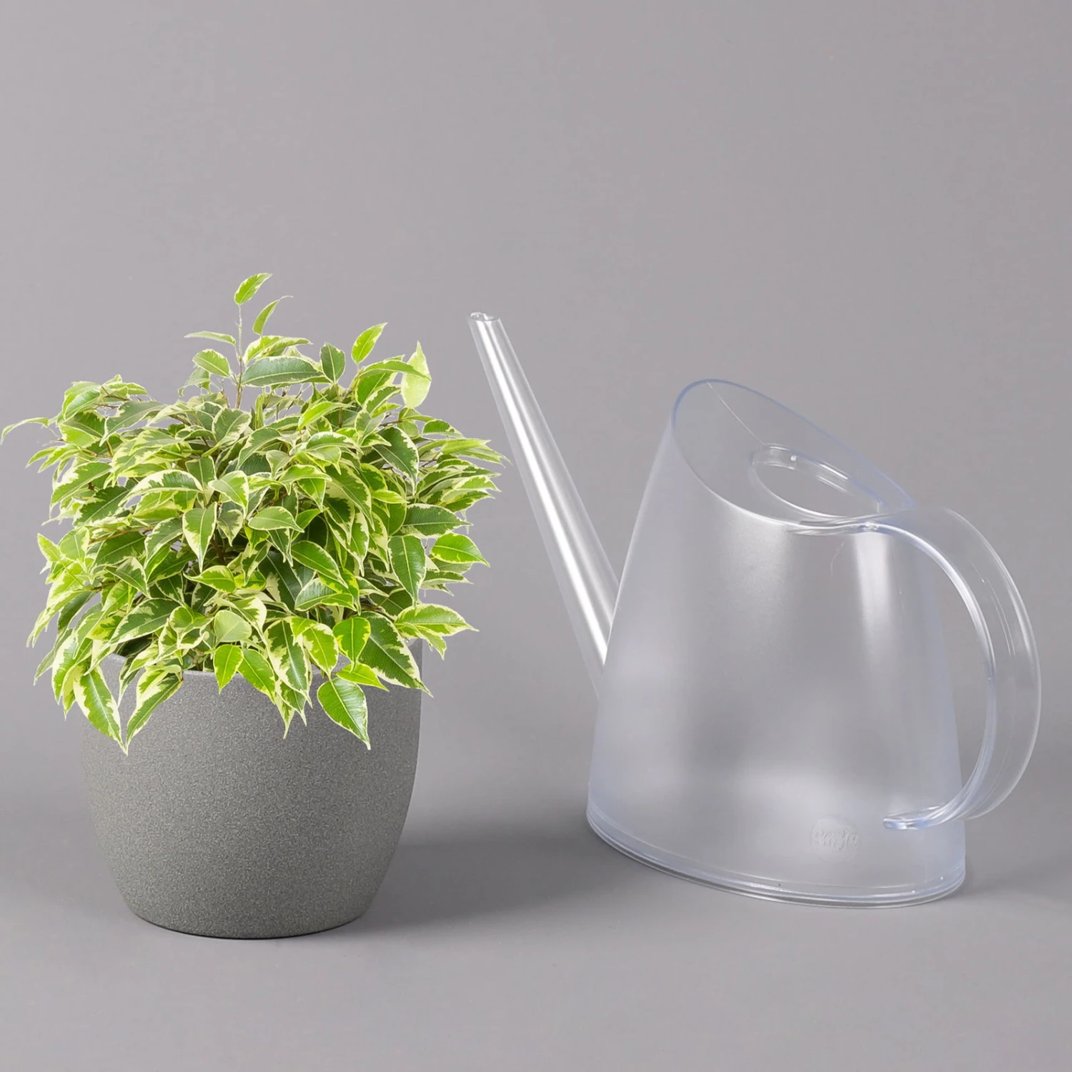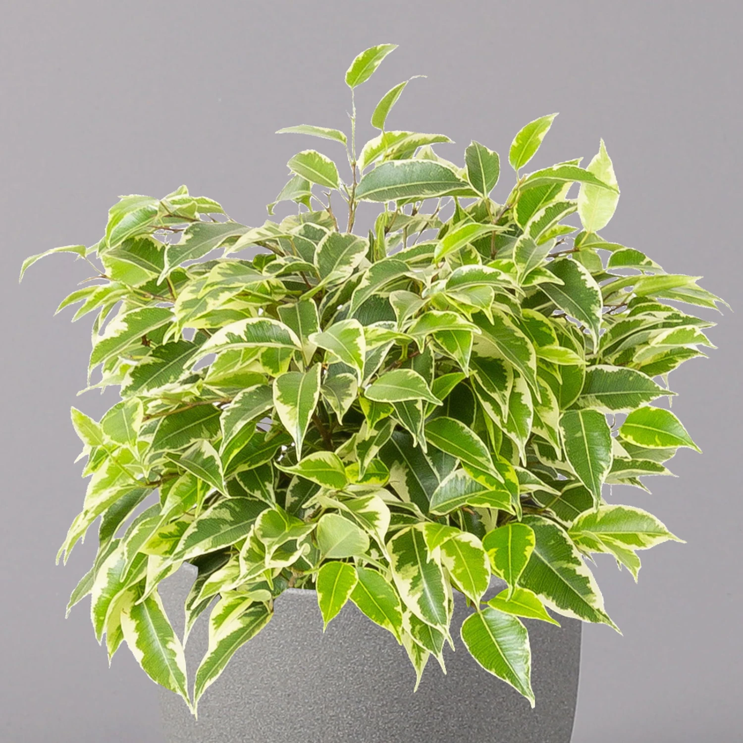 Die Birkenfeige (Ficus benjamina), bei uns auch unter den Namen ‚Benjamini‘ oder einfach nur ‚Ficus‘ bekannt, ist eine klassische Grünpflanze für Zimmer und Büro, die sich seit vielen Jahren großer Beliebtheit erfreut. Charakteristisch sind die elliptischen, zugespitzten Blätter, die je nach Art rein grün oder mit weißer bis gelber Panaschierung versehen sind. Die glänzenden, glatten Blätter sitzen an auffallend dünnen Zweigen, die an den Spitzen leicht überhängen. Die Sorte ‚Kinky‘ kann bei guter Pflege bis zu knapp 1 Meter hoch werden.
