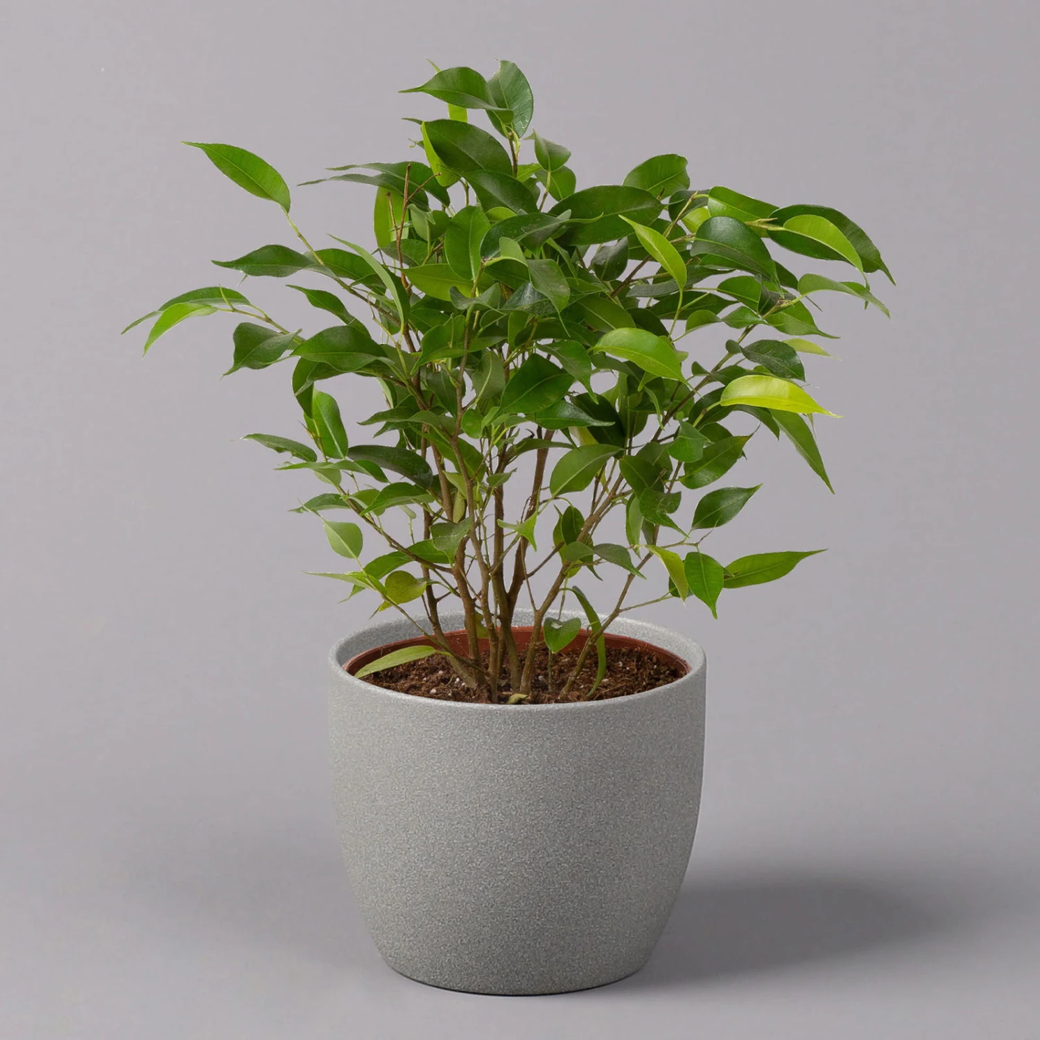 Der Ficus benjamina ‚Natasja’‘ mit seinen dunkelgrünen, glänzenden Blättern ist ein Highlight für jeden Raum. Bekannt ist diese Zimmerpflanze auch unter dem Namen Birkenfeige und besticht mit ihrem buschigen Wuchs und den spitz zulaufenden Blättern. Ihre Birkenfeige macht sowohl im Wohnzimmer als auch im Office eine gute Figur und fühlt sich in hellen sowie halbschattigen Lagen gleichermaßen wohl. Auch für Ihr Schlafzimmer ist der Ficus benjamina ‚Natasja‘ die richtige Wahl, da er Schadstoffe, wie z.B. Kohlenmonoxid abbauen kann. Gießen Sie den Ficus eher sparsam, das Substrat können Sie gerne antrocknen lassen. Im Sommer dürfen Sie Ihre Birkenfeige auch im Freien an einem windgeschützten Standort ohne direkte Sonneneinstrahlung stellen. Achten Sie darauf, dass es der Pflanze nicht zu kalt wird, denn auch im Winter dürfen die Lufttemperaturen im Raum nicht unter 15 Grad Celsius fallen. Bitte stellen Sie Ihre Birkenfeige außerhalb der Reichweite von Kindern oder Hautieren auf, da ihr Milchsaft giftig ist.