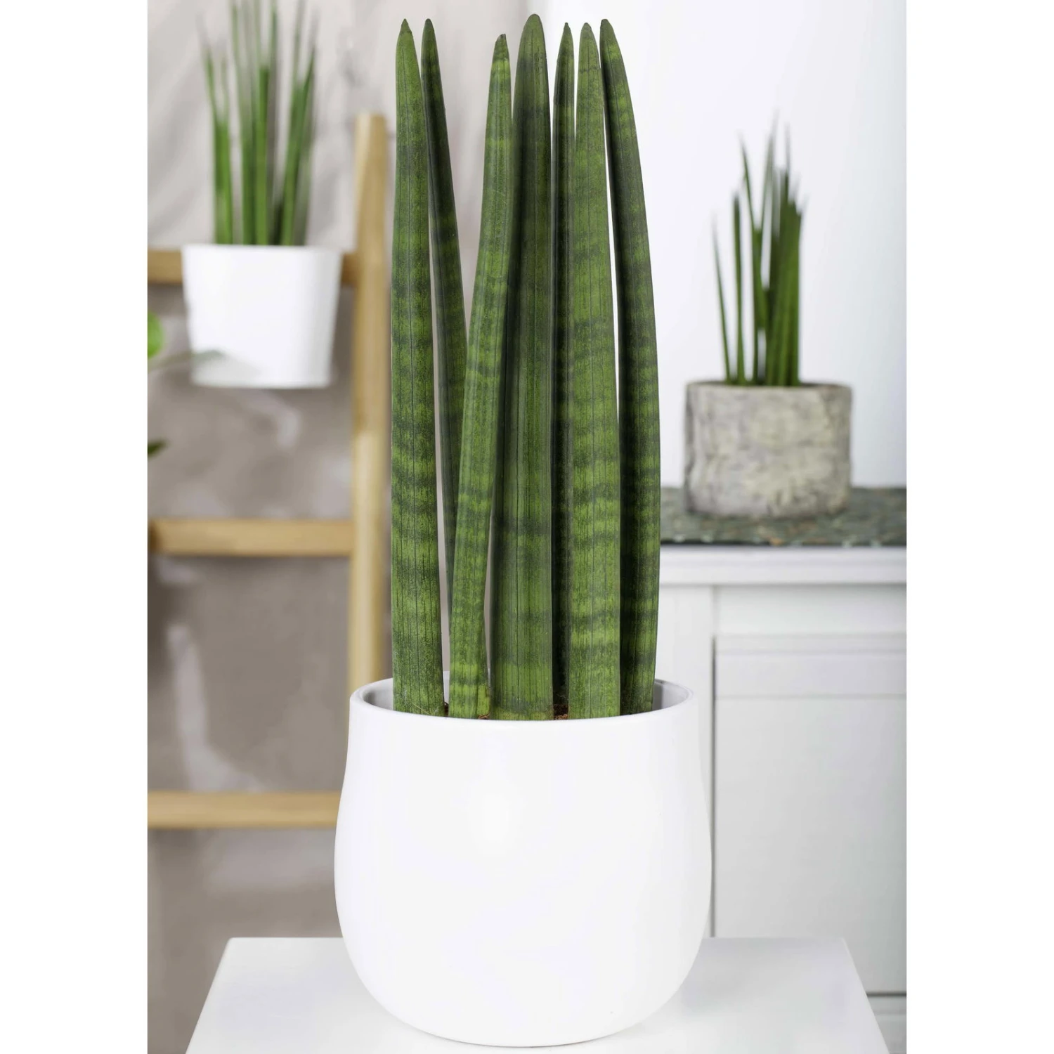 Die Sansevieria cylindrica ‚Straight‘ zeichnet sich durch ihren aufrechten Wuchs und dezente Blattmaserung aus. Diese Bogenhanf-Art gehört zu den beliebten Zimmerpflanzen und macht in einem Büro, im beheizten Wintergarten oder auch in Ihrem Wohnzimmer gleich gute Figur. Mit dem Bogenhanf kaufen Sie übrigens einen natürlichen Luftfilter für ein besseres Raumklima. Hinsichtlich der Pflege präsentiert sich die Sansevieria cylindrica ‚Straight‘ als sehr genügsam. Die Pflanze fühlt sich an einem sonnigen Standort recht wohl, verträgt aber auch Halbschatten und sogar Schatten. Als Substrat eignen sich lehmige und sandige Böden, die Sie nach Möglichkeit leicht angefeuchtet halten sollen. Zum Düngen dürfen Sie gerne ein Zimmerpflanzendünger nehmen. Im Sommer darf die Sansevieria cylindrica ‚Straight‘ gerne regen- und windgeschützt als Kübelpflanze ins Freie.