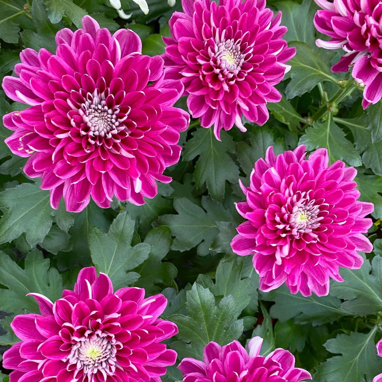 Die gelappten, formschönen Blätter der Chrysantheme (Chrysanthemum indicum ‚Chrysanne® Zembla Next Purple‘) überzeugen mit einem dunklen Grün. Die Chrysantheme wächst aufrecht. Die krautige Pflanze kann eine Wuchshöhe von ca. 40 cm erreichen.