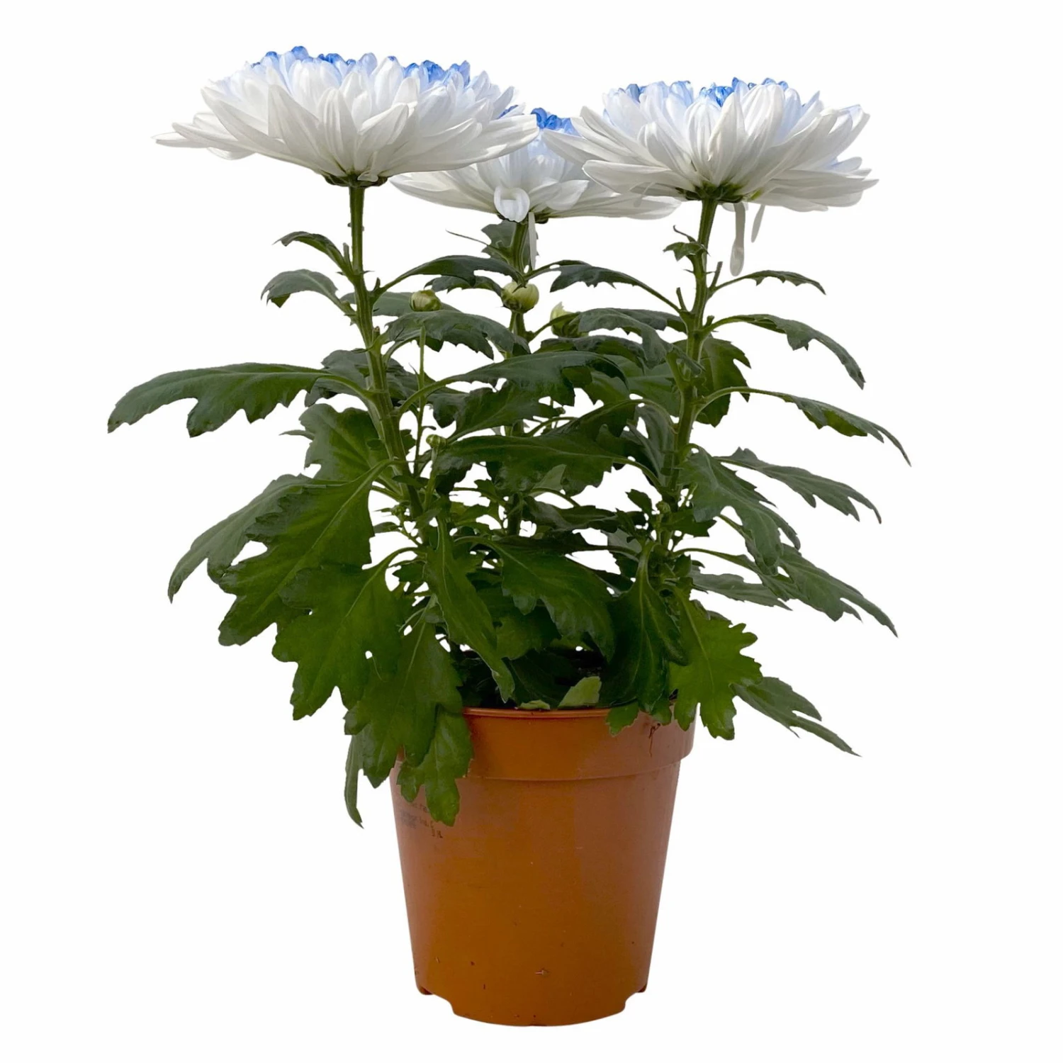 Die großen, dekorativen Korbblüten sind aus zahlreichen Zungen- und Röhrenblüten zusammengesetzt. Die Chrysantheme blüht von August bis November in einem herrlichen Weiß, dass teilweise eingefärbt wurde, und setzt damit besondere Akzente in Ihrer Bepflanzung.