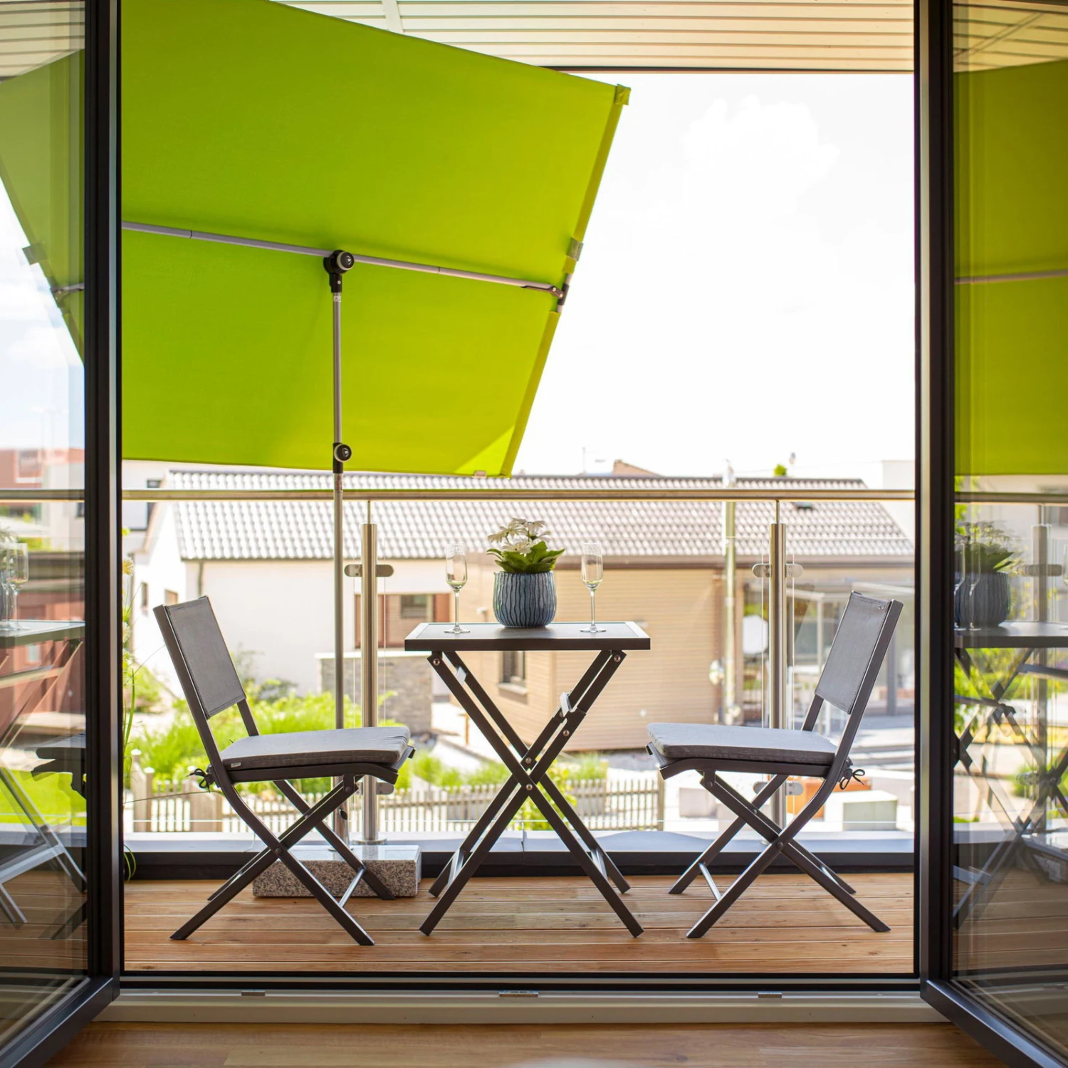 Mit diesem praktischen Möbelset von Doppler verwandeln Sie sogar einen kleinen Balkon in eine Komfortoase. Der Tisch mit robuster Glaskeramikplatte und die Sitzmöbel mit Alugestell sind pflegeleicht und witterungsbeständig. Das Balkon-Möbelset ‚Expert‘ nimmt nicht nur wenig Platz ein, sondern lässt sich auch mit wenigen Handgriffen zusammenklappen.
