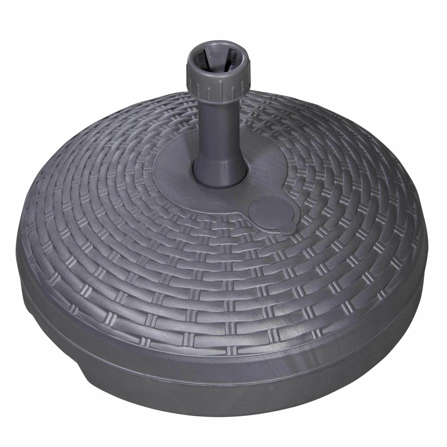 Ihr Sonnenschirm benötigt einen schweren Sockel, um stabil zu bleiben. Dieser praktische Sockel aus wetterbeständigem und robustem Polyurethan überzeugt nicht nur mit seiner Funktionalität, sondern auch mit einem ansprechenden Design. Der Sockel präsentiert sich in einer rustikalen Geflechtoptik und ist je nach Ihrem Wunsch entweder mit Sand oder mit Wasser zu befüllen. Der Füllsockel in Rattandesign eignet sich in erster Linie für Mittelstocksonnenschirme mit einem Durchmesser bis 180 Zentimetern. Dank eines Tragegriffes lässt sich der Sockel sogar im gefüllten Zustand mit relativ geringem Aufwand transportieren.