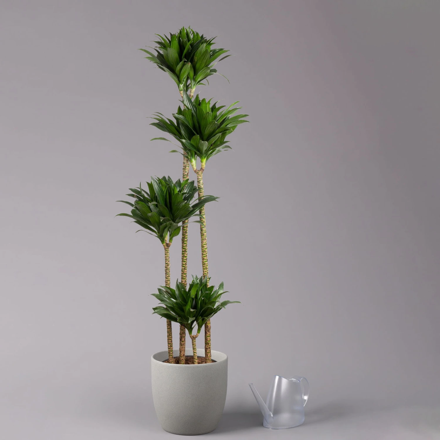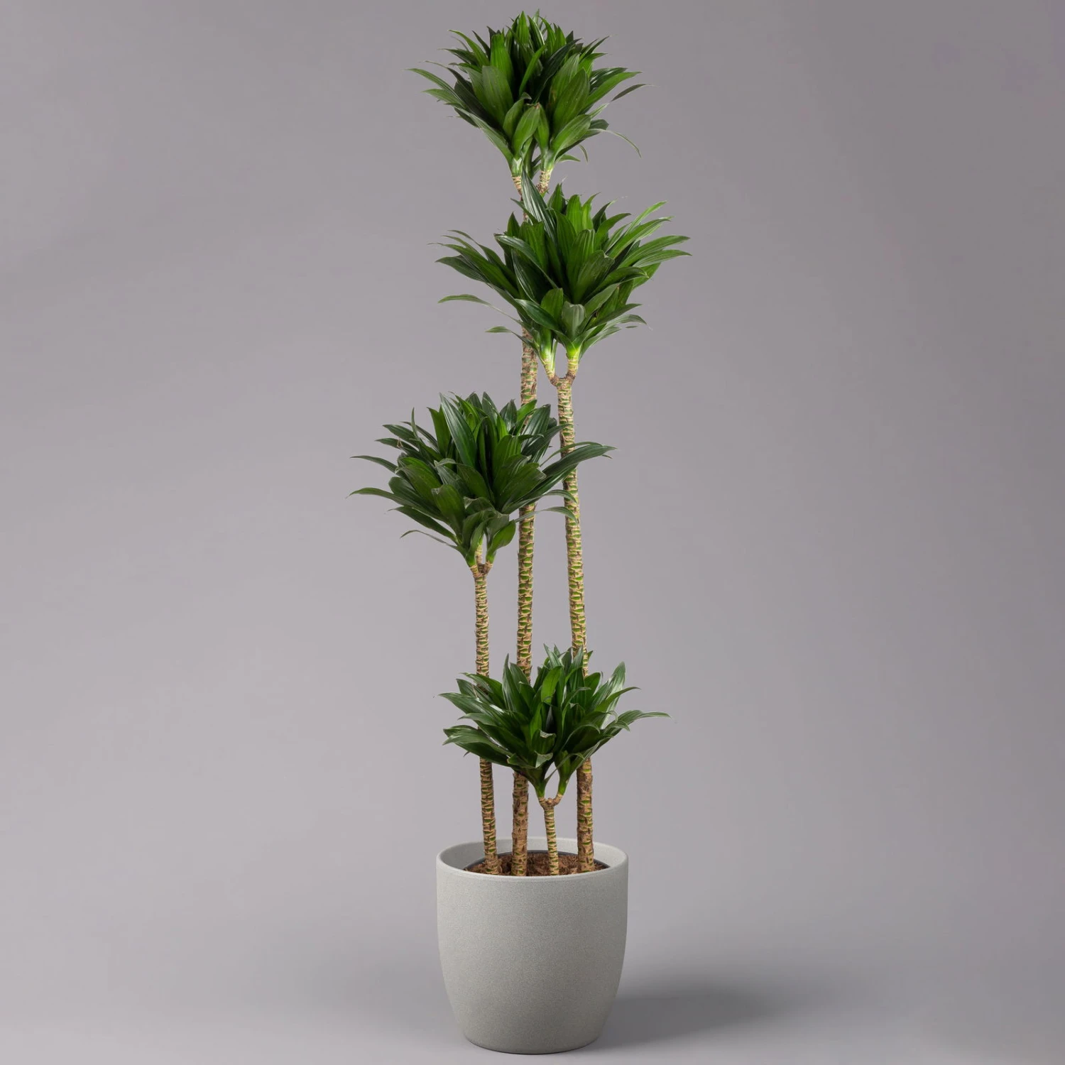 Der Drachenbaum ‚Compacta‘ (Dracaena fragrans ‚Compacta‘) mit 4 Trieben (Tuffs) schmückt sich mit tiefgrünen, vielfältig gezeichneten Blättern. Bevorzugt steht der Drachenbaum an einem hellen Standort ohne direkte Sonne, ein zu dunkler Standort kann sich nachteilig auf die Blattzeichnung auswirken. Ideal sind Temperaturen zwischen 18 und 25 °C. Nicht nur optisch überzeugt der Drachenbaum ‚Compacta‘. Er filtert zudem Schadstoffe aus der Raumluft und eignet sich somit ideal als Büropflanze oder für Wohnräume.