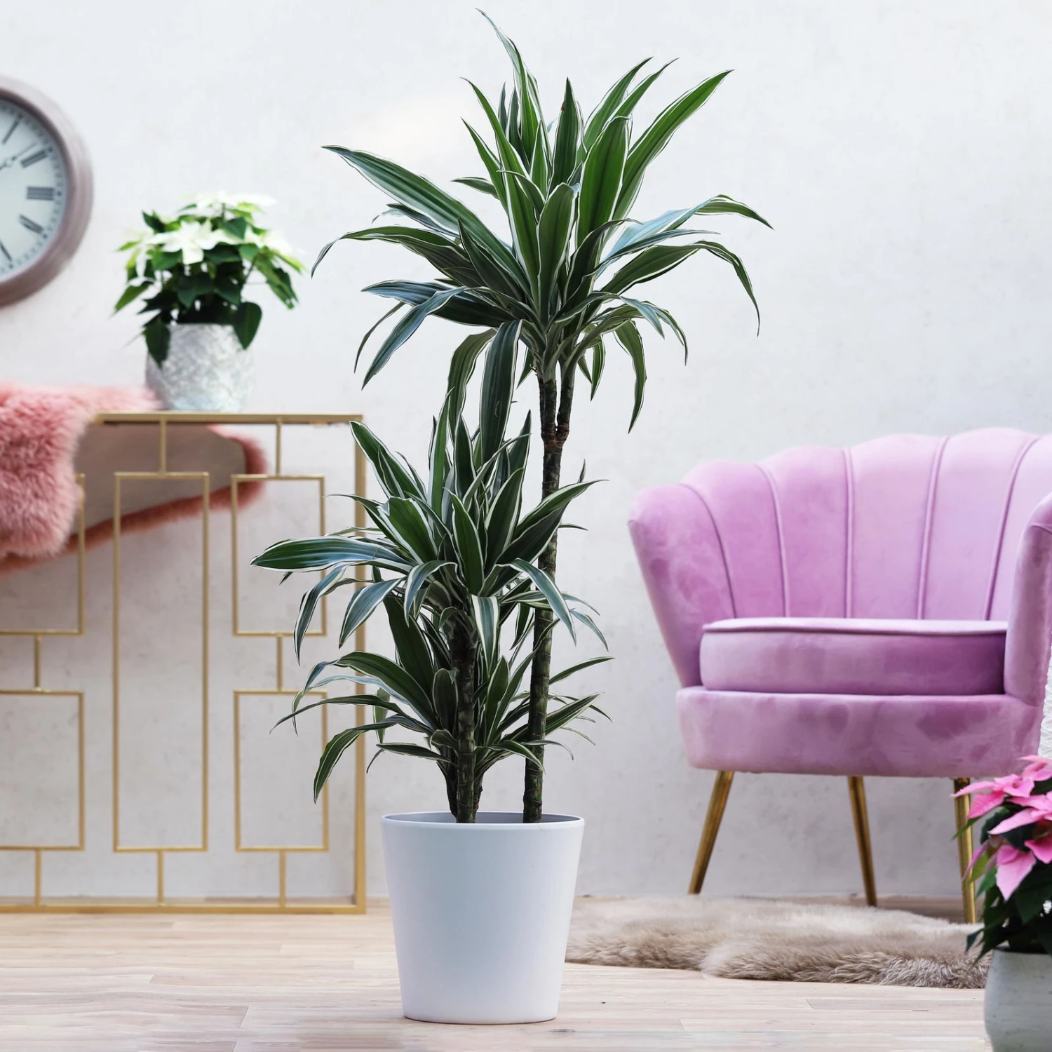 Diese Zierpflanze zeichnet sich durch eine markante Blattmaserung mit weißen Streifen aus. Die Dracaena fragrans ‚White Stripe‘ ist ein kompaktes und zugleich imposantes Spargelgewächs, das sich als anpassungsfähig und langlebig erweist. Wenn Sie die Dracaena richtig pflegen, kann die Pflanze stattliche Wuchshöhen bis zu 2 bis 3 Metern erreichen und entwickelt sich dabei rundum harmonisch. Ein Grund, Drachenbäume zu kaufen, ist es, für die bessere Luftqualität im Raum zu sorgen. Nachweislich sind diese Gewächse imstande, solche Schadstoffe wie Xylole oder Benzole sowie Feinstäube zu binden. Der Drachenbaum ‚White Stripe‘ fühlt sich an einem gut ausgeleuchteten Standort ohne direkte Sonne besonders wohl. Gießen Sie diese Pflanze eher sparsam, das Substrat dürfen Sie gerne antrocknen lassen.