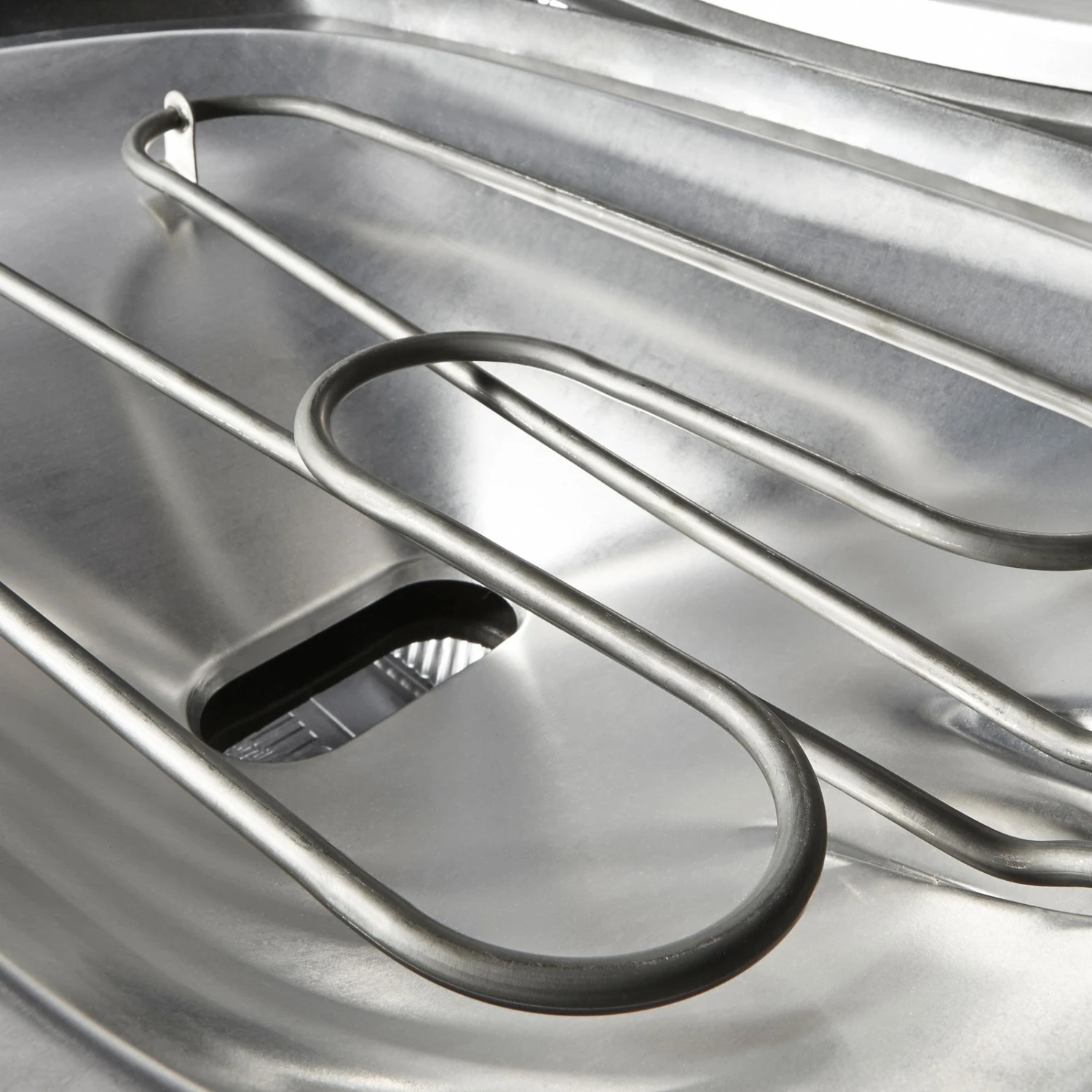 Deckel und Gehäuse aus Aluguss, massiver, zweigeteilter Grillrost aus porzellanemailliertem Gusseisen, große, selbstreinigende Heizspirale, 2.200 Watt, stufenlos verstellbarer Temperaturregler, abnehmbare Fettauffangschale, Glasfaserverstärkter Nylonrahmen, Grillfläche ca. 54 x 39 cm
