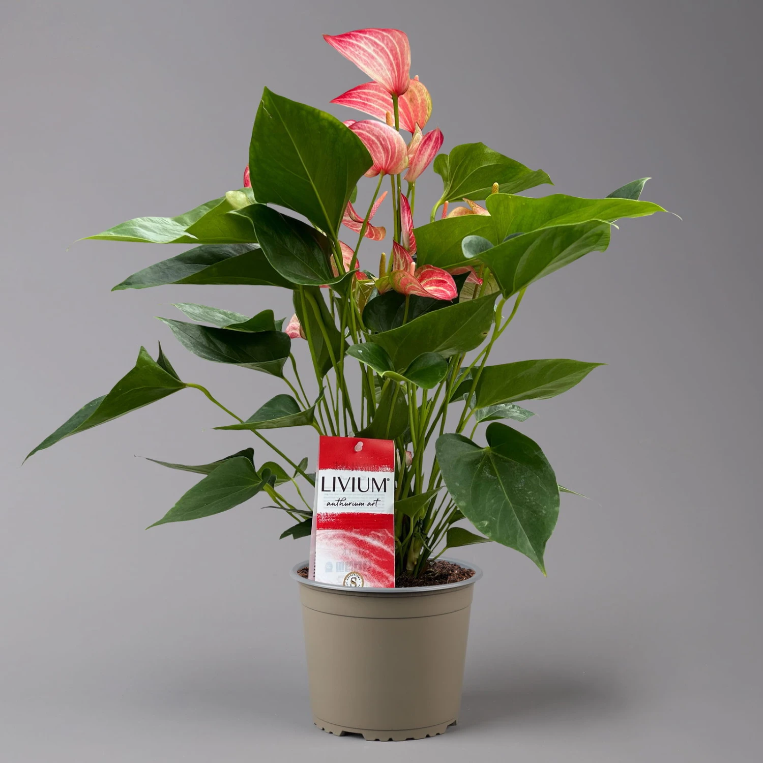 Die Flamingoblume (Anthurium andreanum ‚Livium Red‘) ist eine klassische blühende Zimmerpflanze und besticht mit einfacher Pflege und apartem Aussehen. Charakteristisch sind die kräftig grünen, glänzenden Blätter, die oval bis herzförmig ausgebildet sind und an einem längeren Stiel stehen. Die horstbildende Zimmerpflanze wächst aufrecht bis buschig und kann eine Höhe von bis zu 50 cm erreichen.