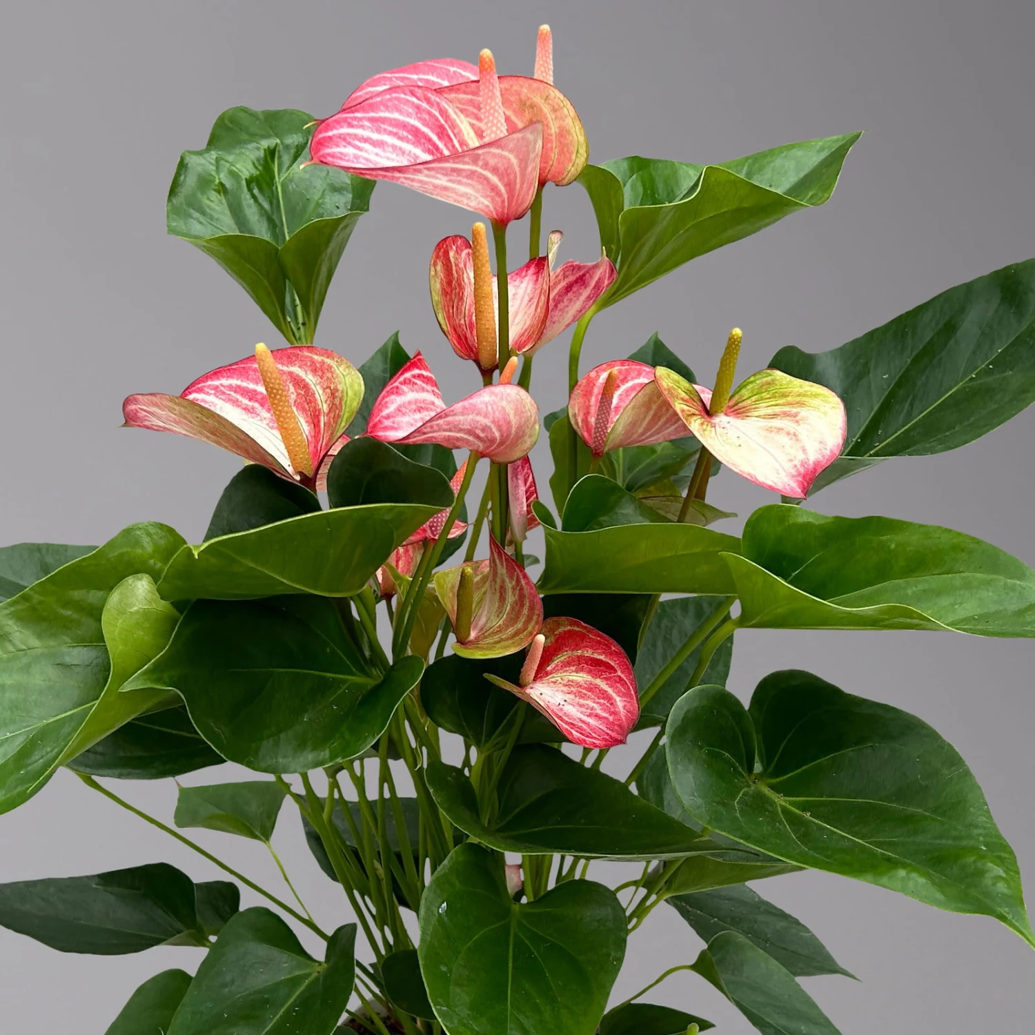 Die besonderen, farbigen Hochblätter der Flamingoblume (Spatha) werden oft fälschlicherweise für die Blüten der Pflanze gehalten. Wie bei den meisten Pflanzen der Familie der Aronstabgewächse sitzt die eigentliche, kolbenartige, gelbliche Blüte in der Mitte der Hochblätter und ist eher unscheinbar. Das interessante rot-weiß gestreifte Hochblatt, das an der Basis grünlich gefärbt ist, ist der Hauptblickfang und bringt Farbe in Ihr Zuhause. Die Flamingoblume treibt das ganze Jahr hindurch immer wieder neue Blüten aus, die bis zu 3 Monate am Stück stehen.