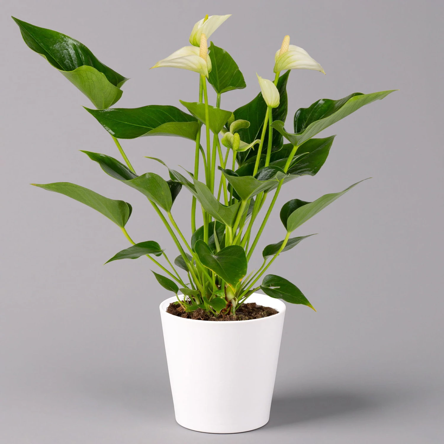 Die Flamingoblume (Anthurium andreanum) ist eine klassische blühende Zimmerpflanze und besticht mit einfacher Pflege und apartem Aussehen. Charakteristisch sind die kräftig grünen, glänzenden Blätter, die oval bis herzförmig ausgebildet sind und an einem längeren Stiel stehen. Die horstbildende Pflanze wächst aufrecht bis buschig und kann eine Höhe von bis zu 50 cm erreichen.