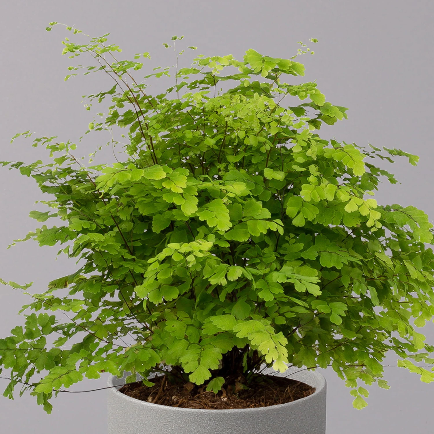 Der Frauenhaarfarn (Adiantum raddianum ‚Fritz Lüthi‘) ist ein aus Südamerika stammender Farn, der sich mit seinen zierlichen Blättern und dem malerischen Wuchs als anmutige Zimmerpflanze für Wohnung und Büro eignet. Charakteristisch sind die dreieckig-abgerundeten Einzelblätter, die an drahtigen, dunklen Stielen stehen und der Pflanze ihr filigranes Aussehen verleihen. Der Frauenhaarfarn wächst buschig und kann bis zu einen halben Meter hoch werden.