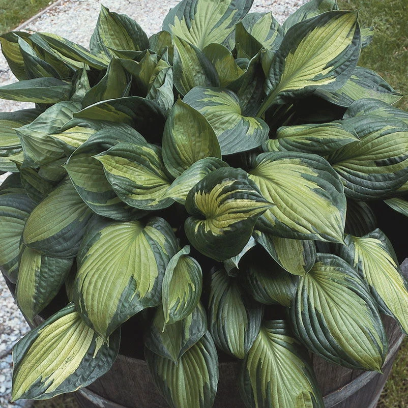 Ihre auffällig gewellten Blätter machen diese Funkien-Sorte zu einer wunderschönen Besonderheit. Die grünrandige Blattschönheit besitzt eine unregelmäßige cremeweiße Mitte mit grünen Adern – ein wahres Kunstwerk aus der Natur. Die atemberaubende Schönheit der Funkie ‚Whirlwind‘ kommt besonders im Vordergrund von Beeten hervorragend zur Geltung.