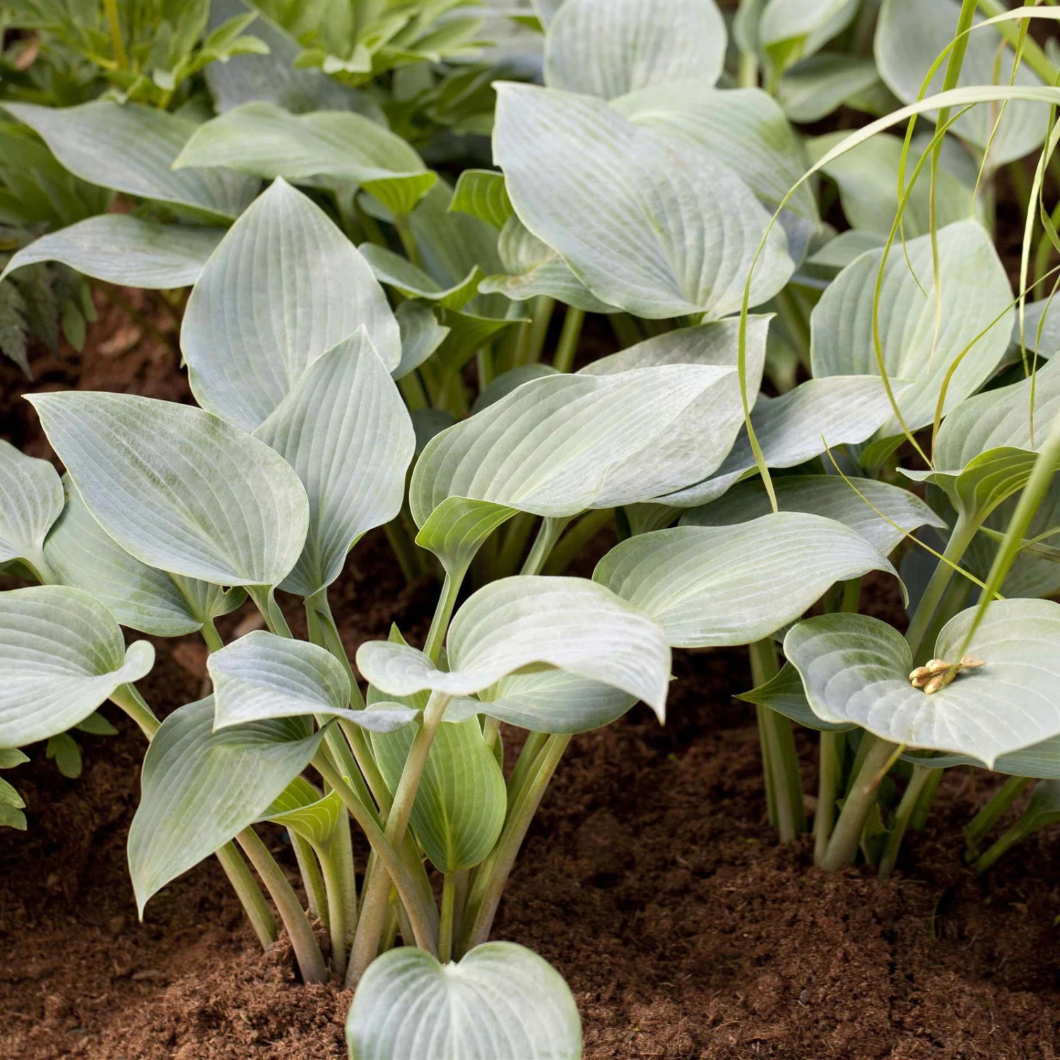 Die Graublaue Funkie ‚Halcyon‘ verzaubert von Mai bis in den Herbst mit herzförmigen, überaus dekorativen graublauen Blättern. In den Sommermonaten werden die herrlichen, farbintensiven Blätter von blass-violetten Blüten in Glöckchenform umspielt. Mit der traumhaften Funkie ‚Halcyon‘, die überaus tolerant gegen Schneckenfraß ist, erstrahlt das Schattenbeet in ganz besonderem Glanz. Die bereift wirkende Blattfärbung ist charakteristisch für die pflegeleichte Staude. Besonders in Gesellschaft von Funkien mit weiß-grünem Laub oder filigranen Gräsern kommt die einzigartige Schönheit dieser traumhaften Blattschmuckstaude optimal zur Geltung.