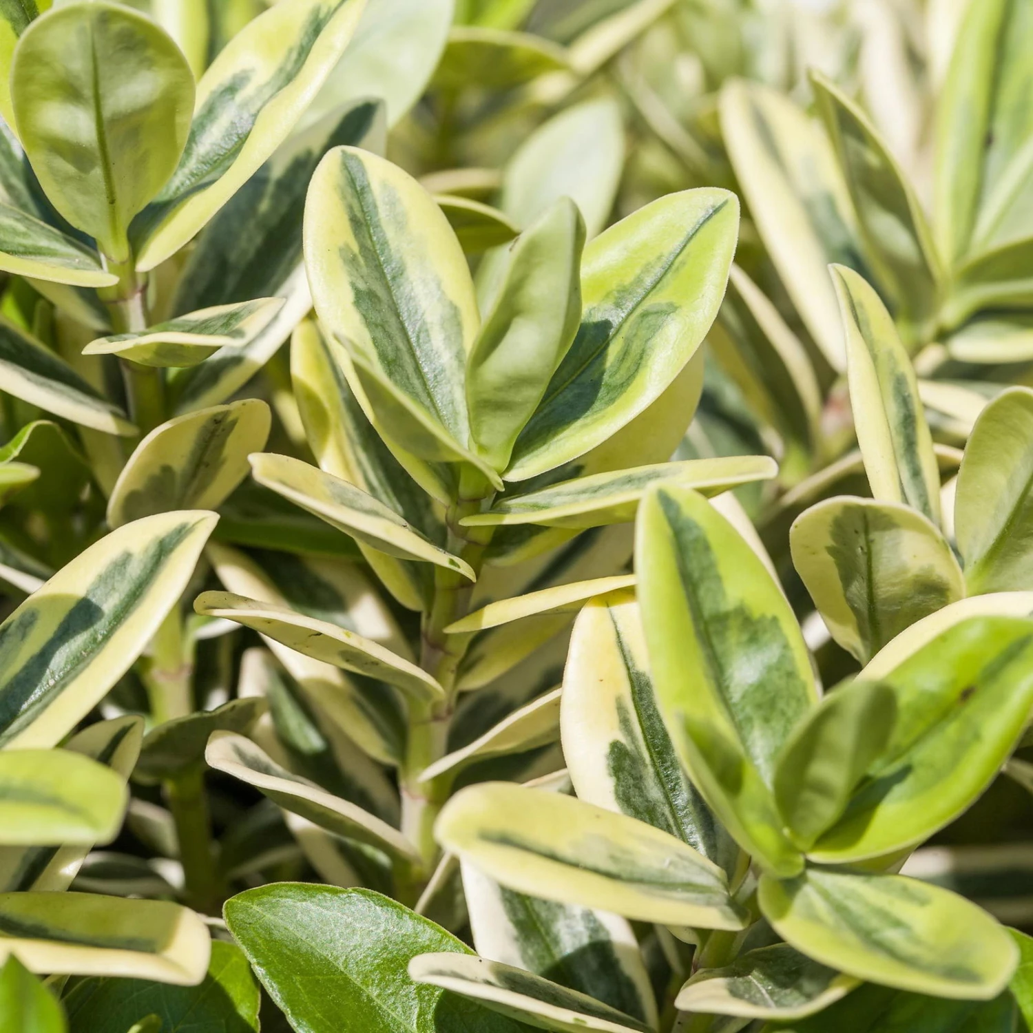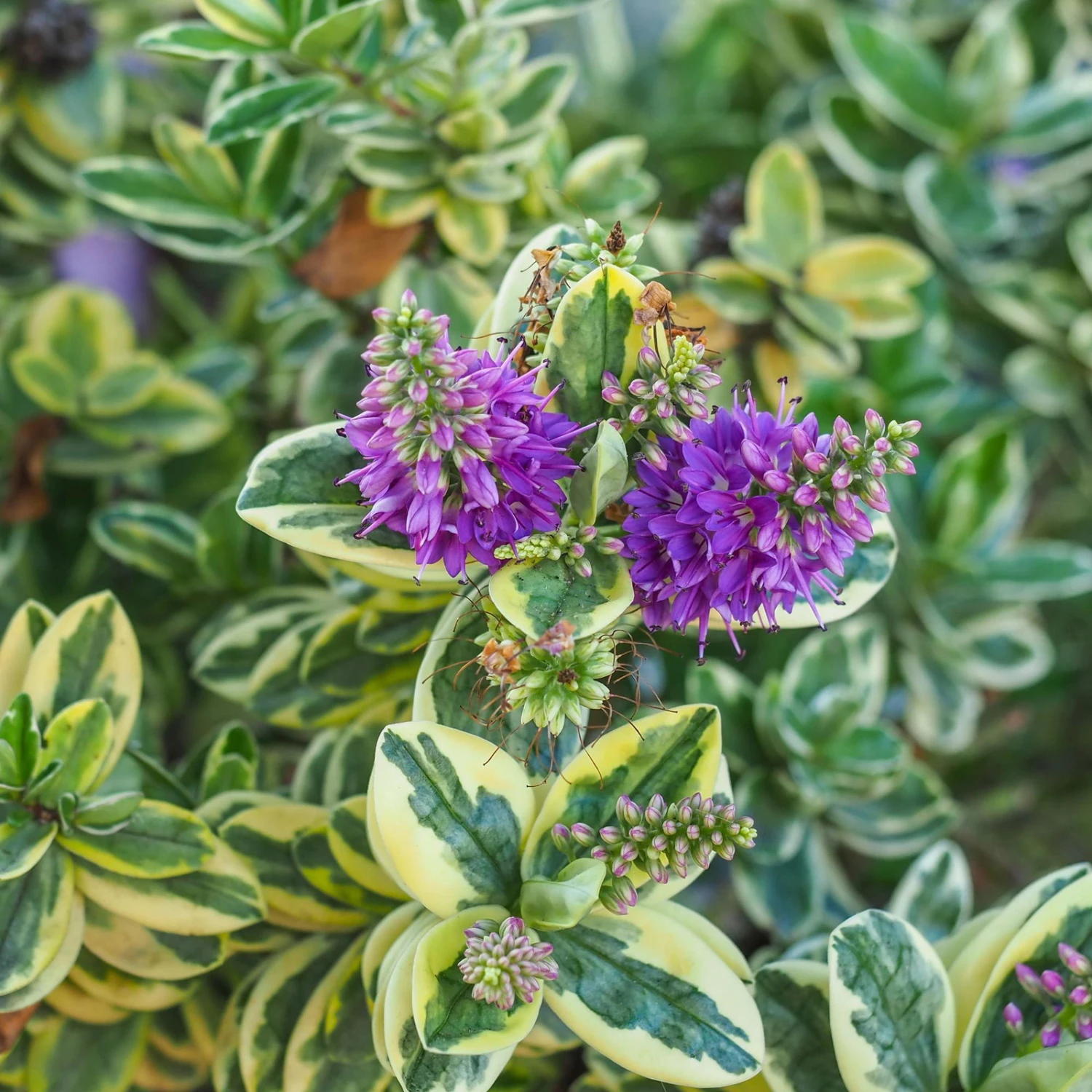 Die großen, buntlaubigen, lang gestreckten Blätter der Strauchveronika (Hebe andersonii Addenda®) überzeugen inden Farben Grün und Weiß. Die Pflanze wächst aufrecht und buschig. Die Strauchveronika kann eine Wuchshöhe von 40 bis 60 cm erreichen und auch entsprechend breit werden.