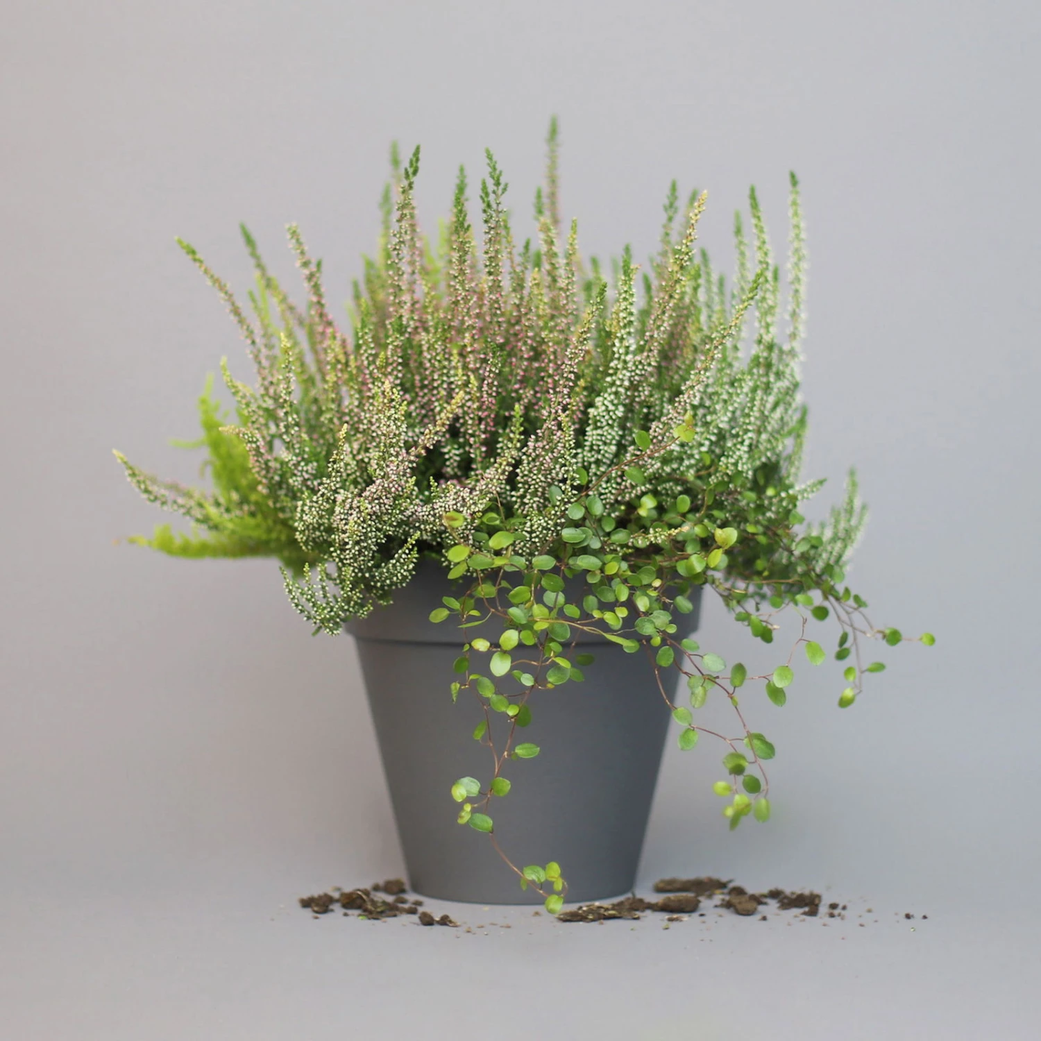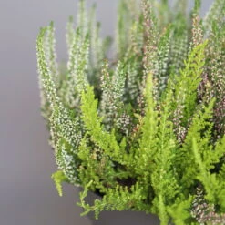 Der Mix aus Knospenheide (Calluna vulgaris), Mühlenbeckia (Mühlenbeckia axillaris) und Baumheide (Erica arborea) bilden mit ihren unterschiedlich aussehenden Blättern eine abwechslungsreiche und herbstliche Einheit. Die Blätter der Mühlenbeckia sind rund, glatt und sattgrün und wachsen an drahtigen, kriechenden Zweigen. Die der Baumheide sind nadelartig und die Blätter der Calluna liegen schuppenförmig am Zweig an. Das gepflanzte Trio wächst buschig und aufrecht, abgesehen von der Mühlenbeckia, die mit leicht überhängendem Wuchs über Töpfe rankt. Die Baumheide ist die größte Pflanze in diesem Heidepflanzen Mix und kann eine Wuchshöhe von bis zu 100 cm erreichen und auch bis zu 60 cm breit werden.