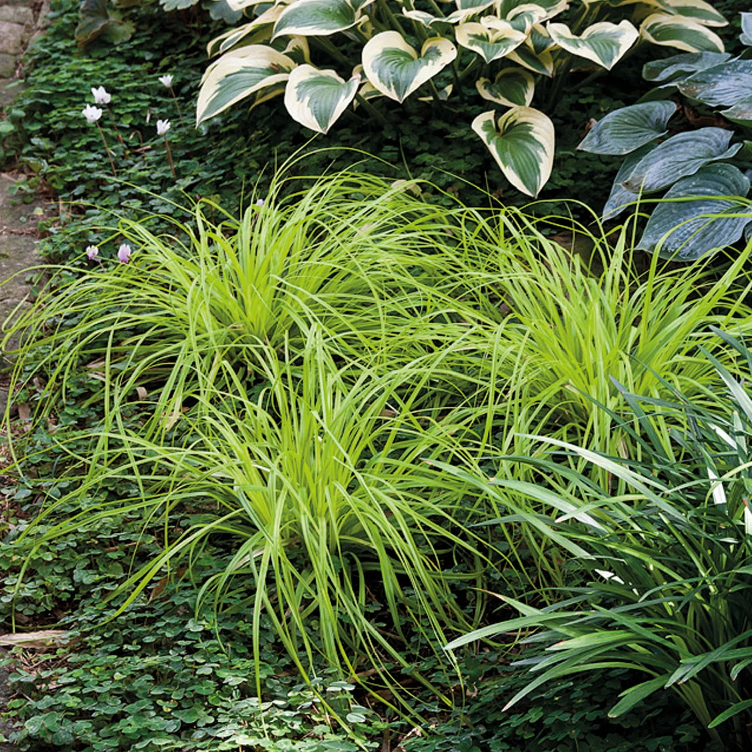Nicht zuletzt aufgrund der hellgrünen Blattfärbung gilt die Japansegge ‚Everillo‘ (Carex oshimensis) als überaus attraktives Dekogras, welches für Auflockerung in der Beetgestaltung sorgt. Die überhängend wachsenden Halme sind limettengrün und verfärben sich hin zu Goldgelb. In den Frühlingsmonaten wird das zauberhafte Gras von cremeweißen Blütenwedeln geschmückt. Besonders in Steingärten, als Unterpflanzung von Rhododendron oder an schattigen Bereichen unter Gehölzen und am Gehölzrand fühlt sich die Japansegge ‚Everillo‘ wohl. Wer den Zauber winterharter Gräser nicht nur im Garten, sondern auch auf dem Balkon oder der Terrasse genießen möchte, trifft mit der Japansegge ‚Everillo‘ genau die richtige Wahl, denn dieses Gras eignet sich hervorragend zur Pflanzung in Kübeln.