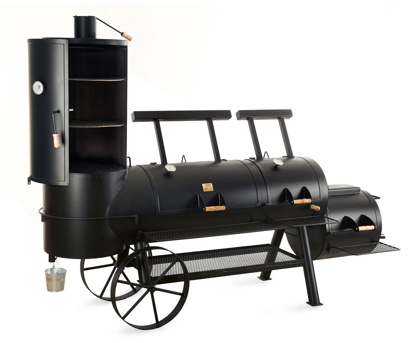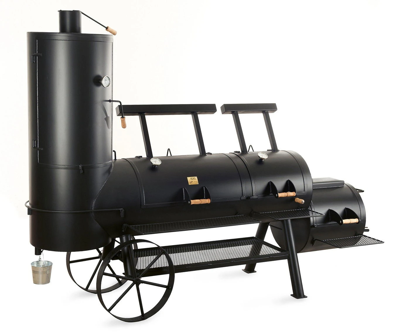 Mit dem Joe’s Barbeque Smoker 24″ Extended Catering entscheiden Sie sich für die XXL Version des Joe’s Barbeque Smoker 24″. In sorgfältiger Handarbeit hergestellt, besteht dieser Smoker aus massivem Stahlrohr mit der original Wandstärke von 6,35 mm, Edelstahlrosten mit 6 mm starken Stäben und einem massiven Feuerboxrost mit 16 mm Stabstärke. Eine doppelte Garkammertür, ein Catering-Einsatz, Hitzeverteilungssystem, Grilling Box sowie eine zweite dritte Rostebene in der Räucherkammer komplettieren den Joe’s Barbeque Smoker 24″ Extended Catering.