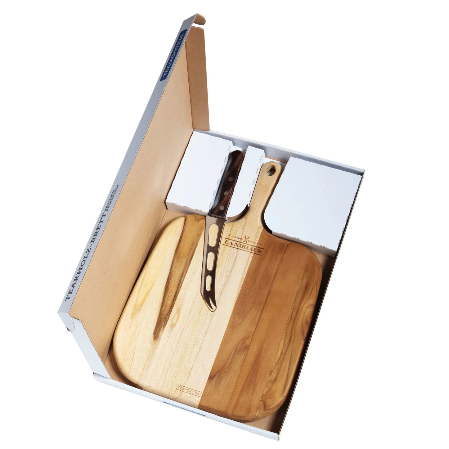 Sie erhalten das elegante Käseschneidebrettchen aus Teakholz und ein passendes Käsemesser von Tramontina Churrasco in einem anspruchsvoll gestalteten Set. Schneiden Sie Greyerzer und Cheddar, Gorgonzola und Camembert ohne Mühe und mit hoher Präzision. Das Käsemesser überzeugt durch eine extraharte Klinge und einen spülmaschinenfesten Holzgriff.