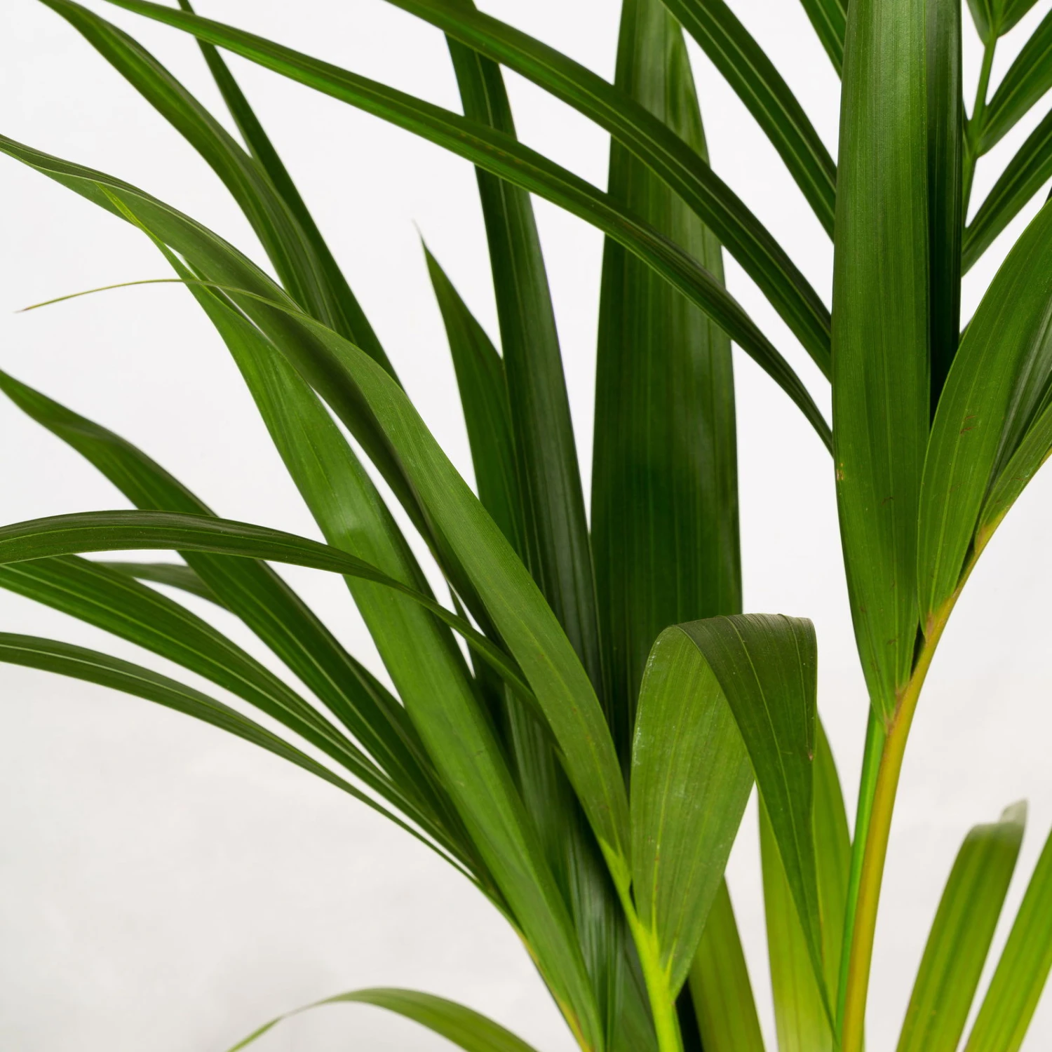 Die Kentiapalme (Howea forsteriana) ist eine langsam wachsende Art, die auf der Lord-Howe-Insel bei Australien beheimatet ist. Diese elegante und pflegeleichte Palme besticht durch ihre fiedrigen, ausladenden Wedel. Suchen Sie für Ihre Howea forsteriana einen hellen Stellplatz aus, an dem die Zimmerpalme vor direkter Sonneneinstrahlung geschützt ist. Halbschattige Standorte werden ebenfalls toleriert, verlangsamen jedoch die Wachstumsgeschwindigkeit noch mehr. Der Wasserbedarf der Kentiapalme ist moderat, Staunässe und Trockenheit sind unbedingt zu vermeiden. Regelmäßige Sprühbäder im warmen, kalkarmen Wasser tun der Palme gut. Pflegen Sie die Howea forsteriana nur in beheizten Innenräumen, da die Umgebungstemperaturen zu keinem Zeitpunkt unter 15 Grad Celsius fallen dürfen.