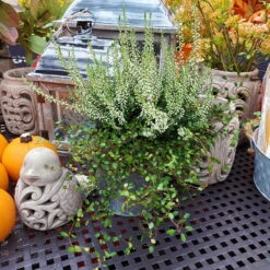 Das Duo Knospenheide (Calluna vulgaris) und Mühlenbeckia (Mühlenbeckia axillaris) begeistert mit einer interessanten Kombination aus Blüten und Blattstruktur. Die Blätter der Mühlenbeckia sind rund, glatt und sattgrün und wachsen an drahtigen, kriechenden Zweigen. Die Blätter der Calluna dagegen liegen schuppenförmig am Zweig an. Der Wuchs der Mühlenbeckie ist leicht über Töpfe hängend. Die Knospenheide im Gegenspiel wächst buschig und aufrecht und kann eine Wuchshöhe von bis zu 50 cm erreichen und auch ebenso breit werden.