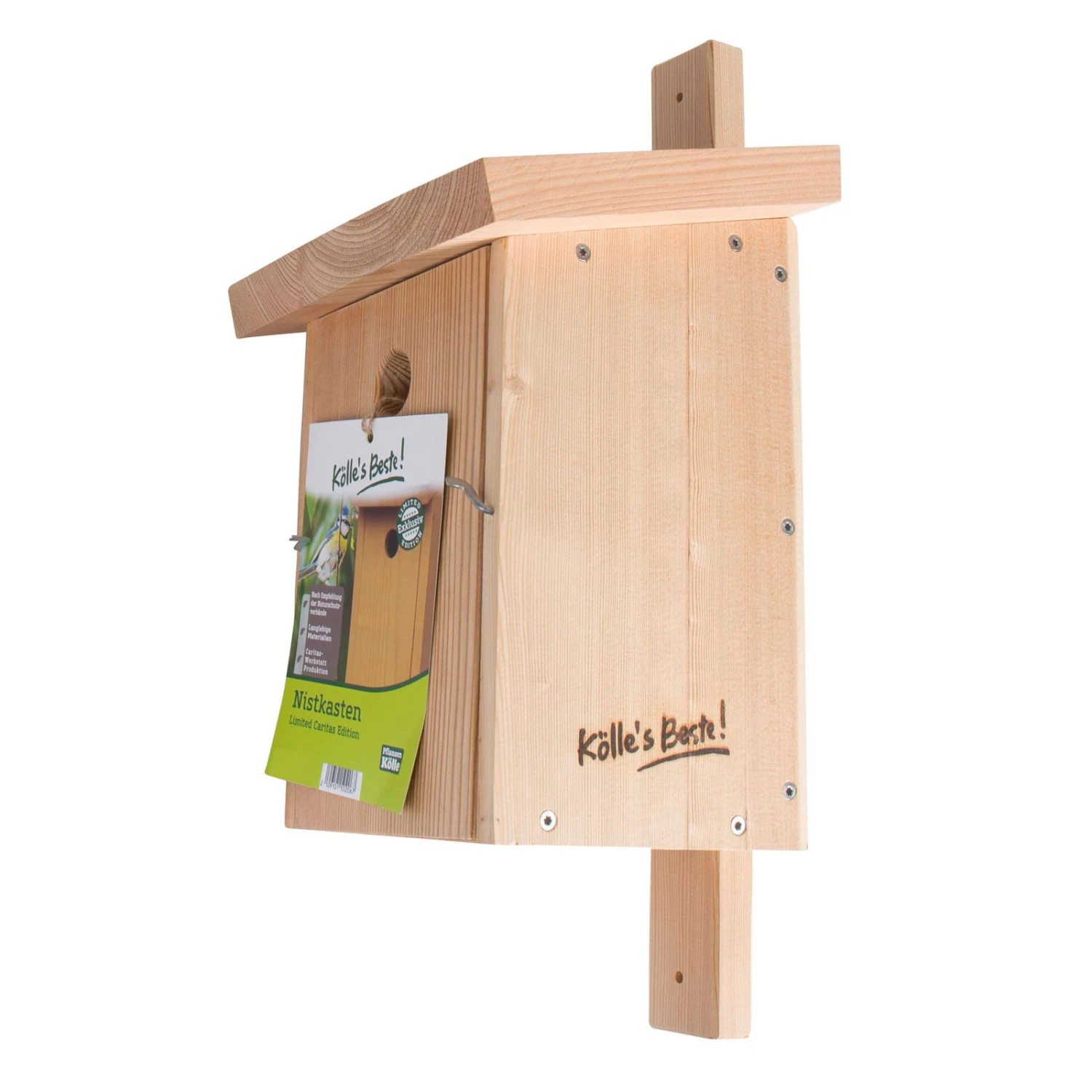 Der Kölle’s Beste Nistkasten Limited Caritas Edition bietet eine wertvolle Nisthilfe für viele Wildvögel. Das Nistkästchen ist entsprechend den Empfehlungen des Naturschutzbundes aus hochwertigem und extrem witterungsbeständigem Lärchenholz in reiner Handarbeit in den Caritas-Einrichtungen Oranienburg hergestellt.