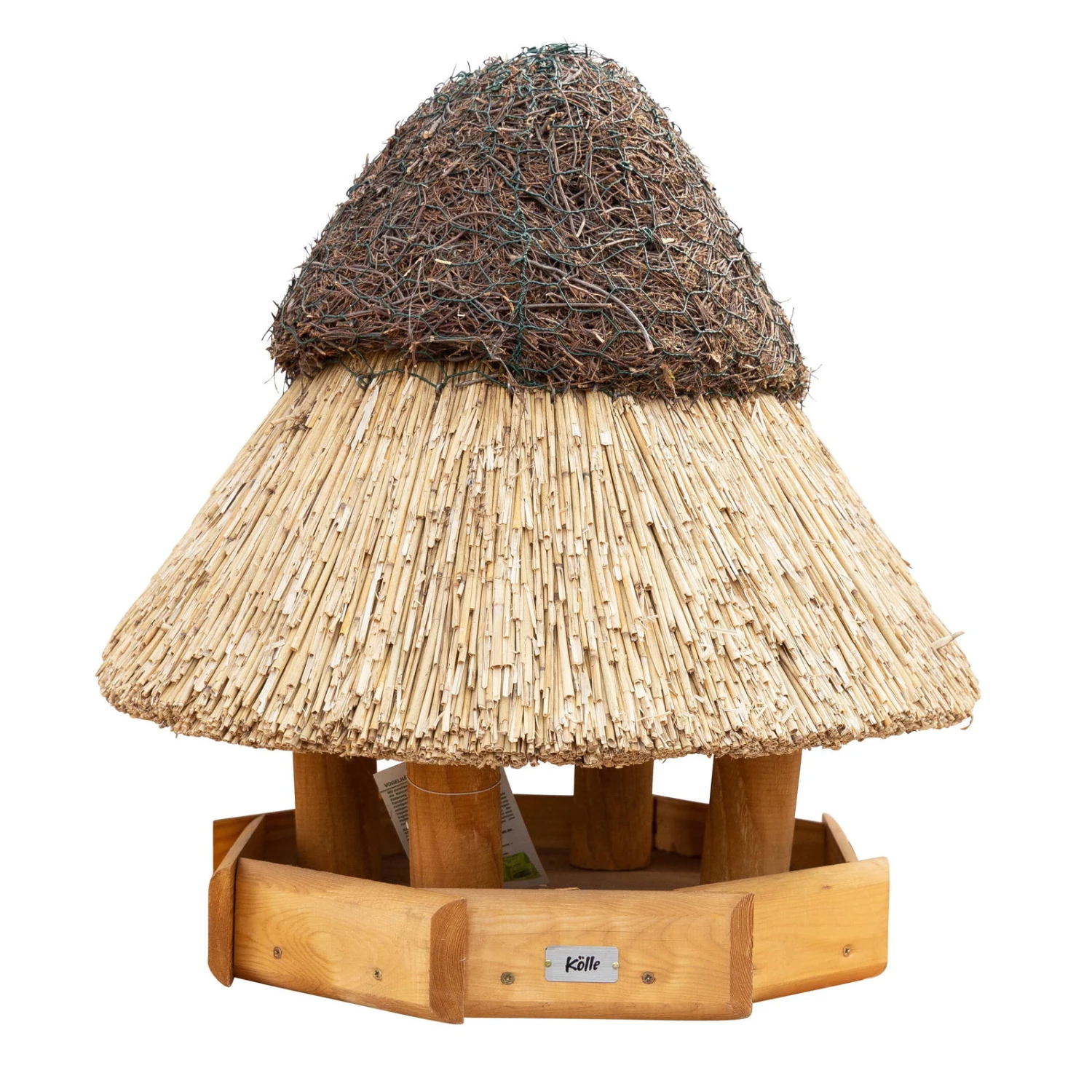 Mit dem Kölle Vogelhaus „Hamburg“ bieten Sie unseren heimischen Wildvögeln eine wertvolle Nahrungsquelle im Winter. Das etwa 65 x 57 x 57 cm große, Kiefer-braune Vogelfutterhaus aus Holz hat alles, was Sie zur Vogelfütterung benötigen: Ein wasserdichtes Reetdach mit Überstand hält das Futter bei Niederschlag zuverlässig trocken. Hochwertig und massiv konstruiert, überzeugt das Vogelhaus in Fachhandwerkerqualität. Seine achteckige Form, das hübsche Dach und die natürliche Farbe machen es zu einer Augenweide.