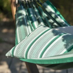 Diese grüne Doppel Hängematte ‚Modesta‘ aus hochwertiger Bio-Baumwolle überzeugt mit ihrer hohen Reißfestigkeit und ihrer Langlebigkeit. Sie ist 350 x 160 cm groß und kann bis zu einem Gesamtgewicht von 160 kg belastet werden. Deshalb ist sie bestens für zwei Personen geeignet, die gemeinsam entspannen möchten.