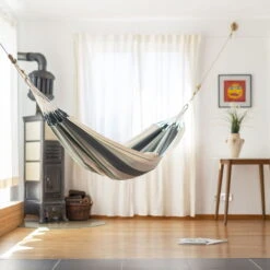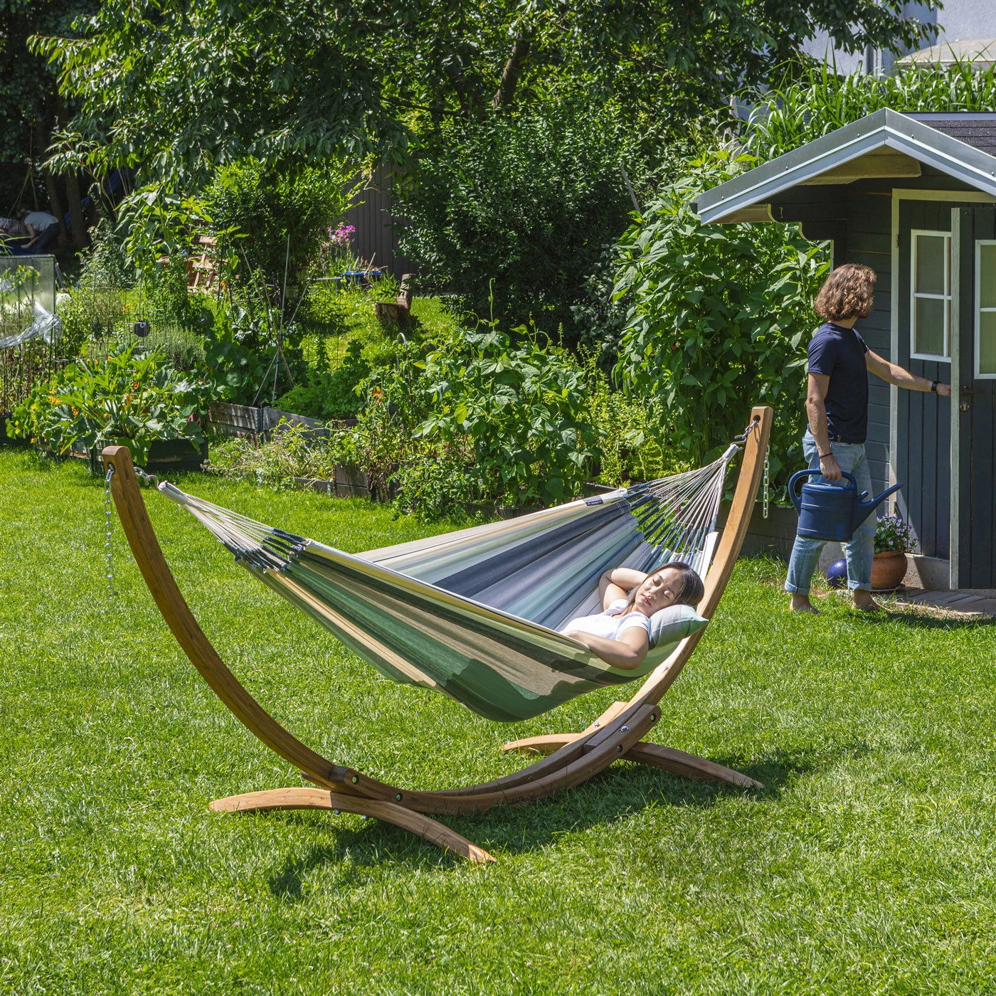 Ein wunderschönes GefĂĽhl der Schwerelosigkeit erleben Sie in der gemĂĽtlichen Single Hängematte ‚Modesta‘. Sie ist aus Bio-Baumwolle gefertigt, die besonders lange Fasern hat und der Hängematte eine hohe ReiĂźfestigkeit verleiht. Dieses beige-grĂĽne Modell mit den MaĂźen 300 x 140 cm ist bis 120 kg belastbar.