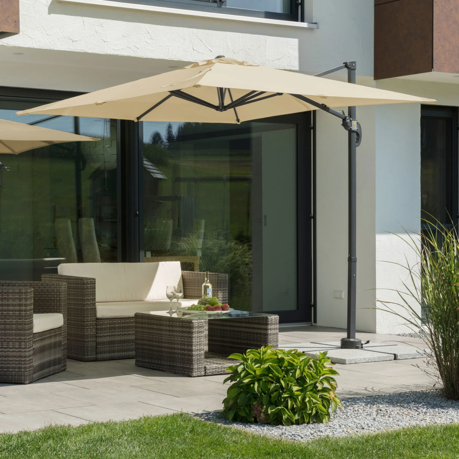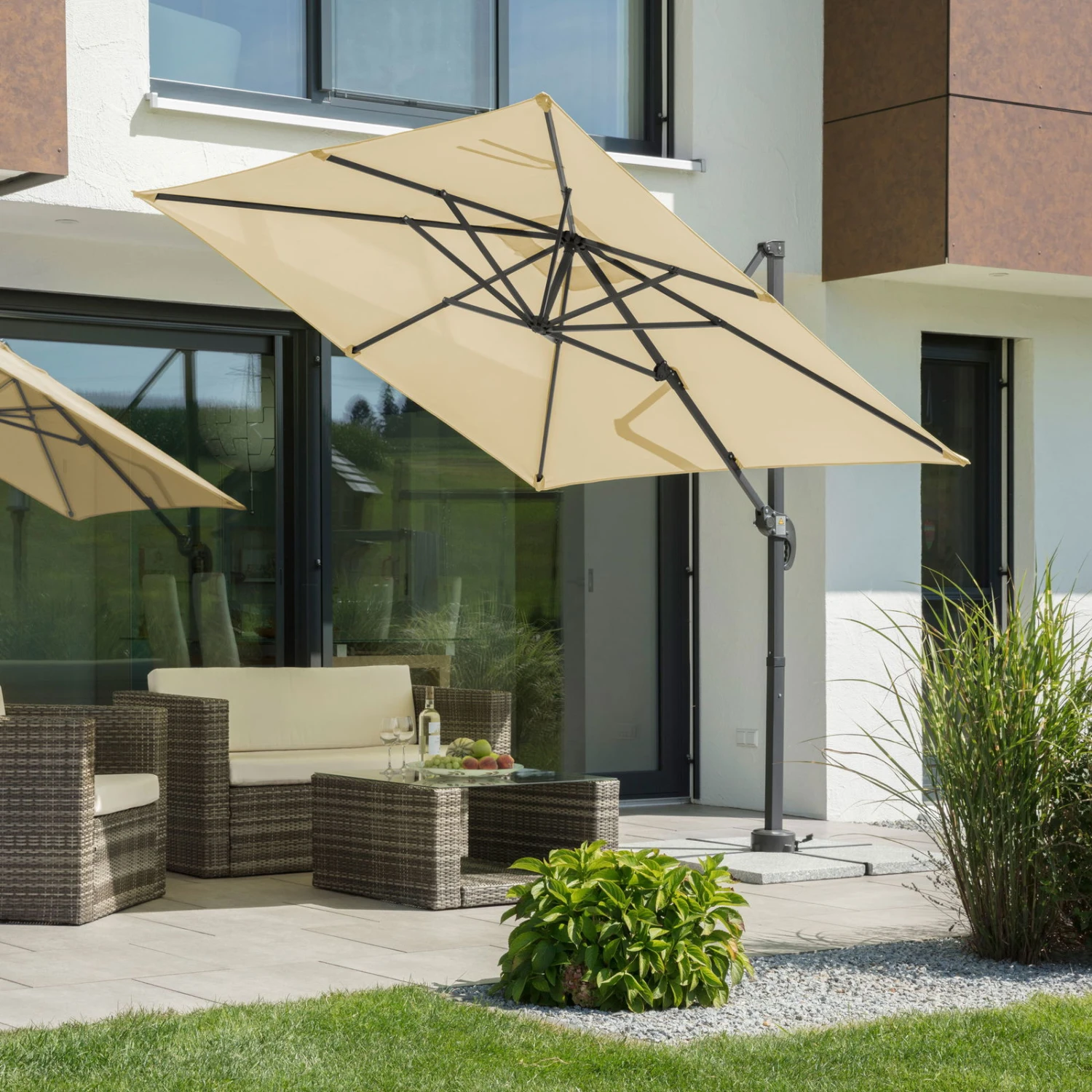 Der Ampelschirm Rhodos Junior von Schneider stellt sich der Sommerhitze in den Weg und spendet wohligen Schatten. Damit Ihre Wohlfühloase von Sonnenaufgang bis zum Sonnenuntergang bestehen bleibt, können Sie den Pendelschirm mit wenigen Handgriffen drehen, neigen und kippen.