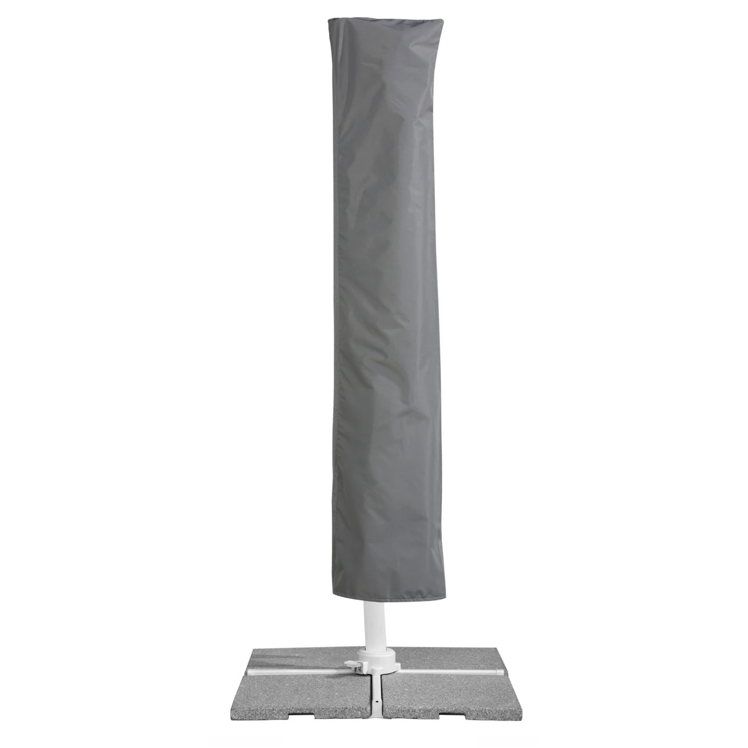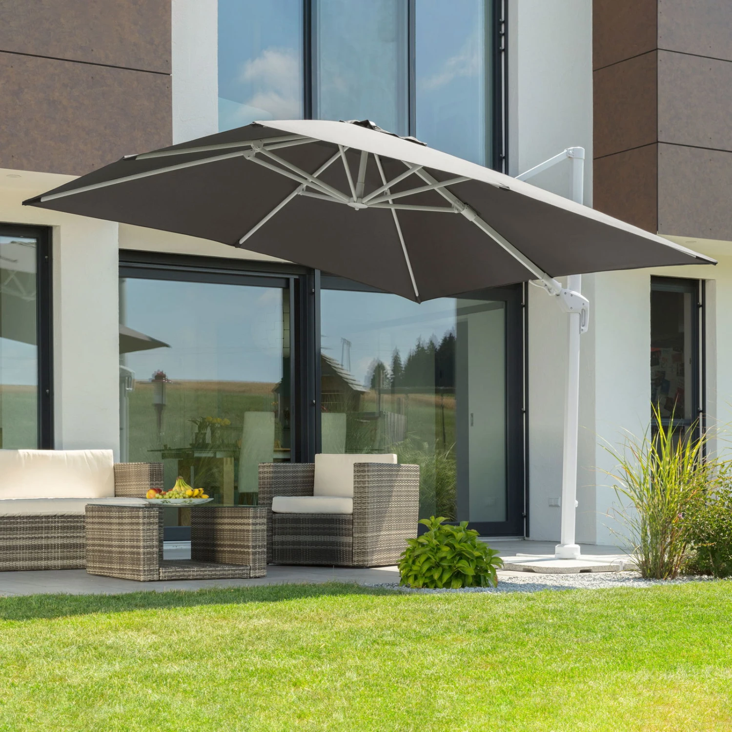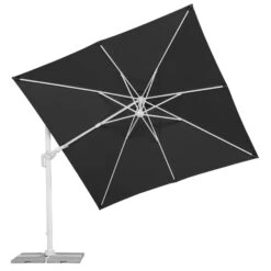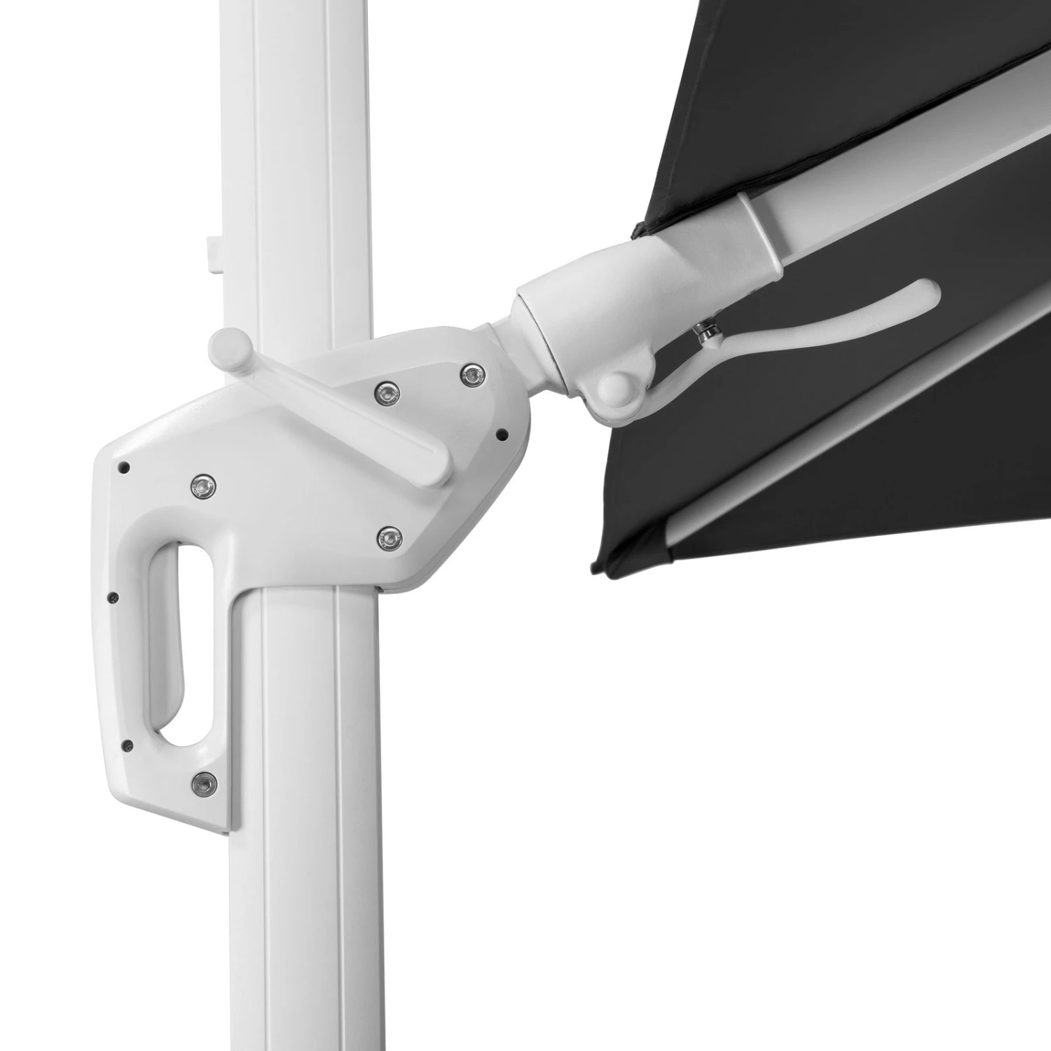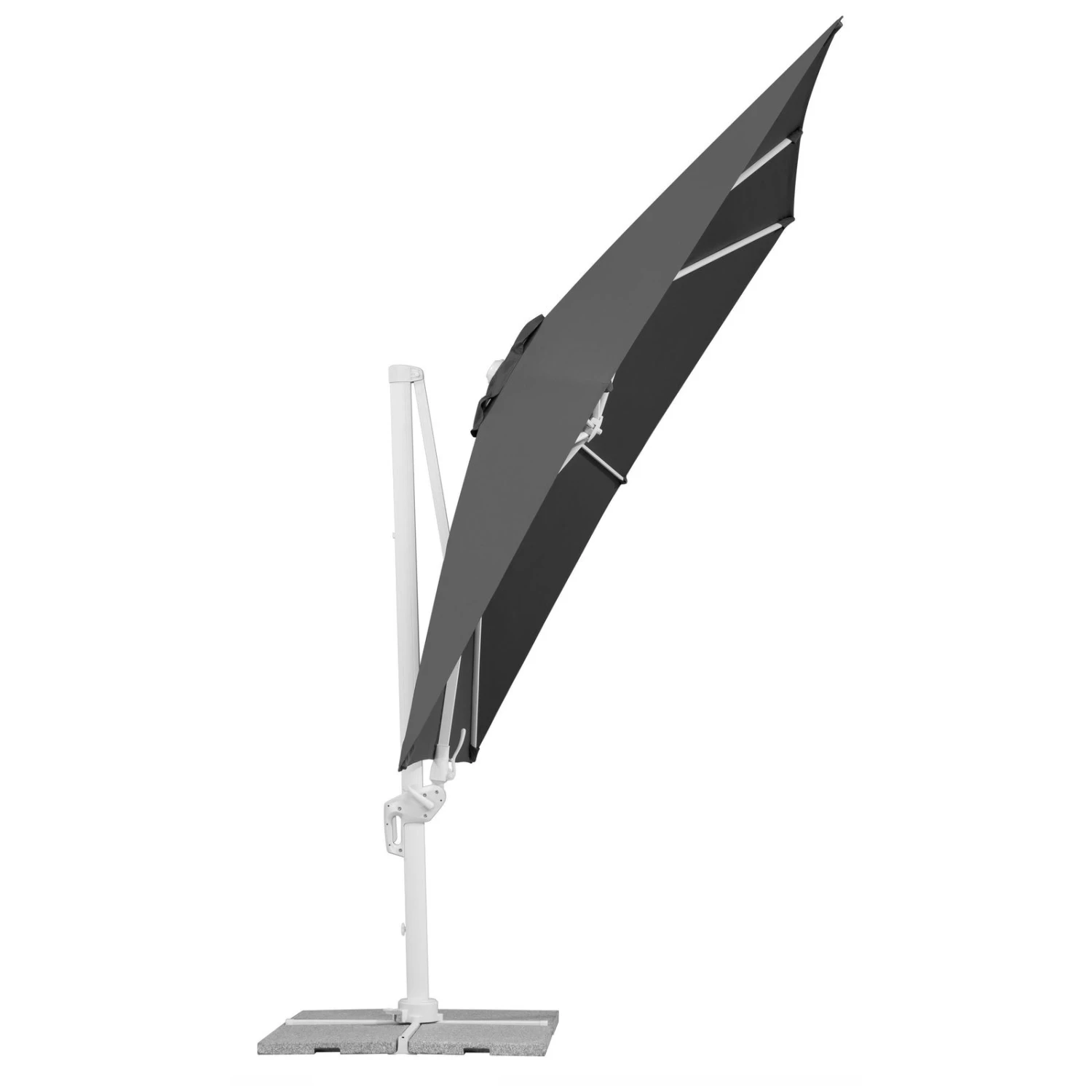 Der Ampelschirm Rhodos Twist Bianco von Schneider schützt Sie zuverlässig vor schädlicher Sonneneinstrahlung. Diesen hochwertigen Sonnenschirm erhalten Sie inklusive einer Schutzhülle mit Reißverschluss und eines Kreuzständers zum Beschweren mit Betonplatten. Dank einer ausgefeilten Mechanik können Sie die Position des Pendelschirms exakt dem Sonnenstand anpassen.