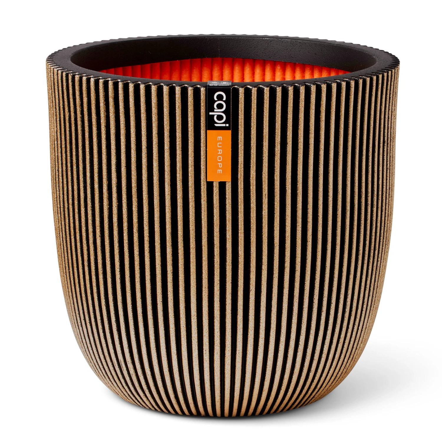 Das Pflanzgefäß ‚Groove‘ besticht mit dekorativer Oberflächenstruktur und einem schicken Kontrast zwischen Gold und Orange. Dieser Pflanztopf von Capi Europe besteht aus recyceltem Kunststoff, ist bruchsicher, UV- und frostfest sowie ein richtiges Leichtgewicht. Wenn Sie das wasserdichte Pflanzgefäß ‚Groove‘ draußen verwenden möchten, bohren Sie ein Ablaufloch in den Boden.
