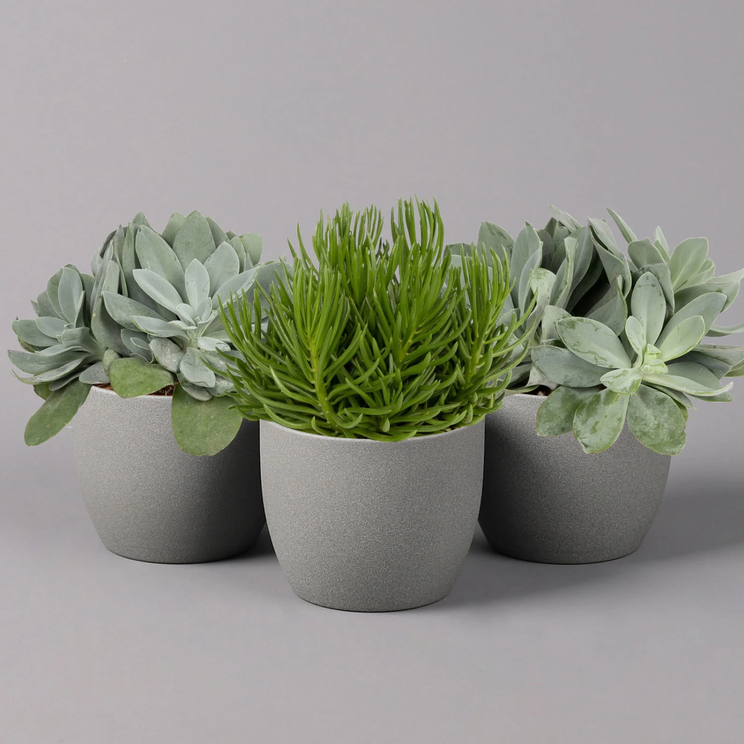 Die Greiskräuter (Senecio-Arten) sind eine große Pflanzengattung, die Pflanzen vieler verschiedener Wuchs- und Strukturformen umfasst. Dieser Mix verschiedener Greiskraut-Arten besteht aus dickblättrigen, sukkulent anmutenden Formen, die sich besonders für die Kultur im Zimmer und warmen Wintergarten eignen.