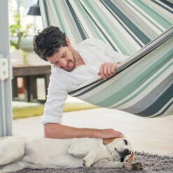 Einfach abhängen und das mit Komfort und Stil. Schaffen Sie sich selbst eine Oase der Ruhe und genießen Sie die Stille gepaart mit dem leichten Schaukeln der Hängematte. Die Hängematte ‚Paloma‘ von La Siesta vermittelt ein Gefühl der Schwerelosigkeit und lässt sich einfach befestigen. Die Hängematte ist aus Bio-Baumwolle und eignet sich mit ihren klassischen und fezenten Farben für Jedermann. Im Garten, auf der Terrasse oder auch im Wohnzimmer – lassen Sie die Seele baumeln und schwingen Sie sich in die Hängematte.