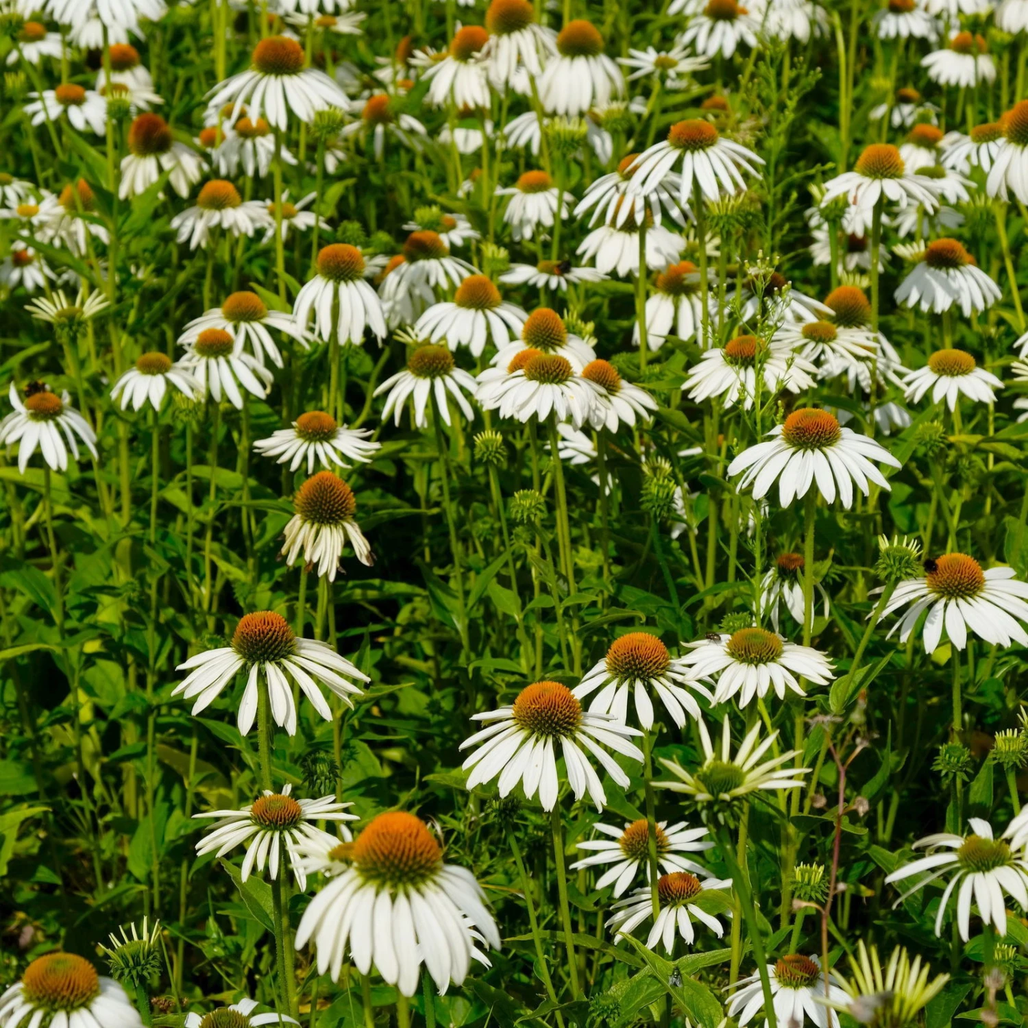 Mit dem weißen Sonnenhut setzen Sie leuchtende Akzente in Staudenbeeten, Rabatten oder Kübeln. Die Sorte ‚Alba‘ bezaubert mit langblühenden, weißen Zungenblüten, die wie kleine Schirmchen aussehen und um eine bräunlich-grüne Mitte angeordnet sind.