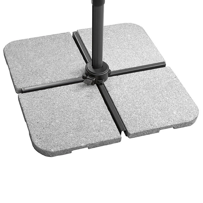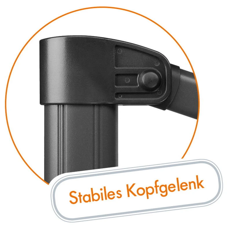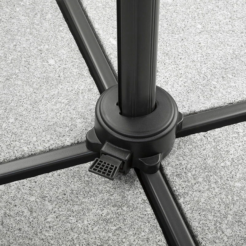 Der zweiteilige Mast aus Aluminium mit den Maßen von ca. 67 x 50 mm ist überdurchschnittlich stabil und trotzt den verschiedensten Witterungseinflüssen. Die 8 eingebauten Dachstreben aus Stahl mit den Maßen von ca. 22 x 13 mm sorgen zusätzlich für weitere Standfestigkeit. Zusätzlich zu diesem Ampelschirm erhalten Sie einen Plattenständer für Wegeplatten. Damit der Schirm sicher steht, beschweren Sie den Plattenständer mit Wegeplatten und auch hier macht sich das geringere Gesamtgewicht bemerkbar, denn zum Beschweren reicht nun ein Mindestgewicht von ca. 100 kg (Bitte beachten Sie: die Wegeplatten sind nicht im Lieferumfang enthalten!).