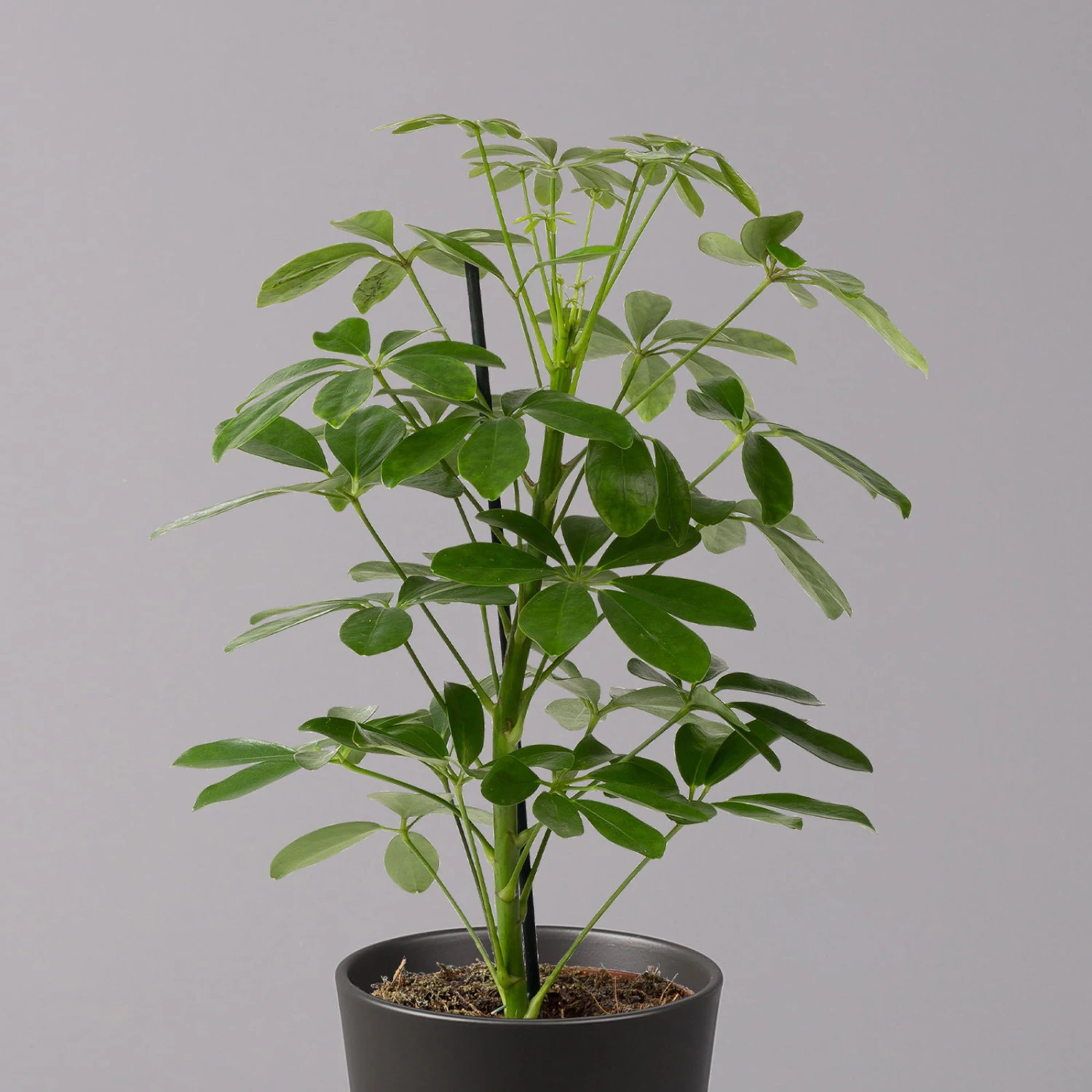 Die Strahlenaralie (Schefflera arboricola) zählt zu den beliebtesten Büropflanzen, da sie sehr robust und besonders schnellwüchsig ist. Die ursprünglich aus Taiwan stammende Tropenpflanze besticht mit den typisch strahlenförmig angeordneten Blättern, die kräftig grün und glänzend sind. Die Pflanze wächst schlank aufrecht und kann bis zu 2 Meter hoch werden. Ab einer gewissen Höhe bietet sich ein Moosstab als zusätzliche Fixierung an, welcher der Pflanze als Stütze dient.