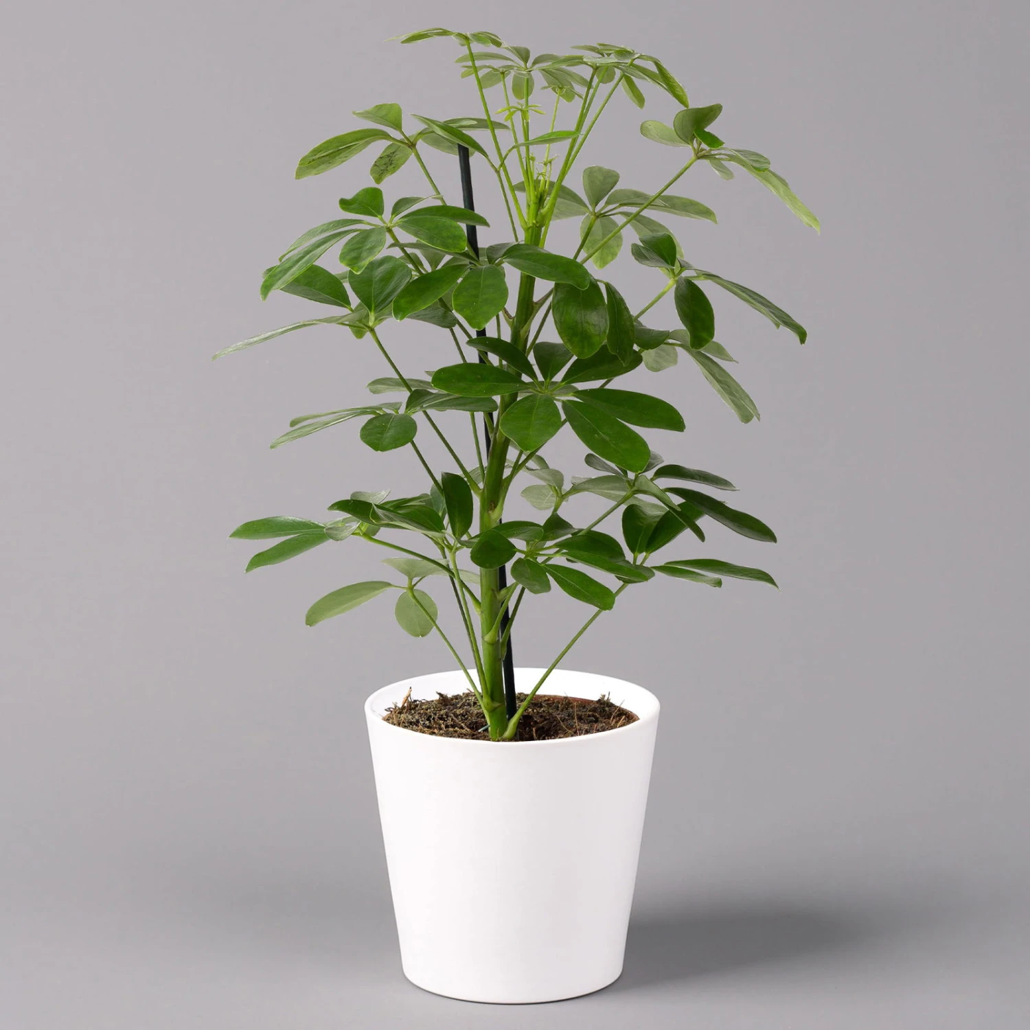 Die Strahlenaralie (Schefflera arboricola) zählt zu den beliebtesten Büropflanzen, da sie sehr robust und besonders schnellwüchsig ist. Die ursprünglich aus Taiwan stammende Tropenpflanze besticht mit den typisch strahlenförmig angeordneten Blättern, die kräftig grün und glänzend sind. Die Pflanze wächst schlank aufrecht und kann bis zu 2 Meter hoch werden. Ab einer gewissen Höhe bietet sich ein Moosstab als zusätzliche Fixierung an, welcher der Pflanze als Stütze dient.